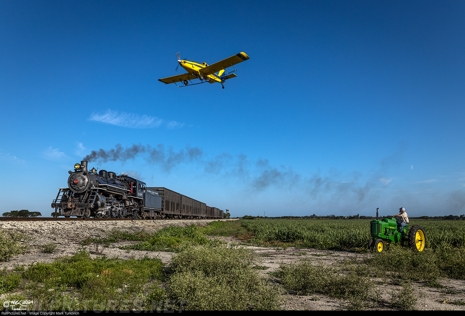 Florida East Coast 148 rests on the point of its empty cane train at Miami Locks as a crop duster flies over the train and a nearby tractor.