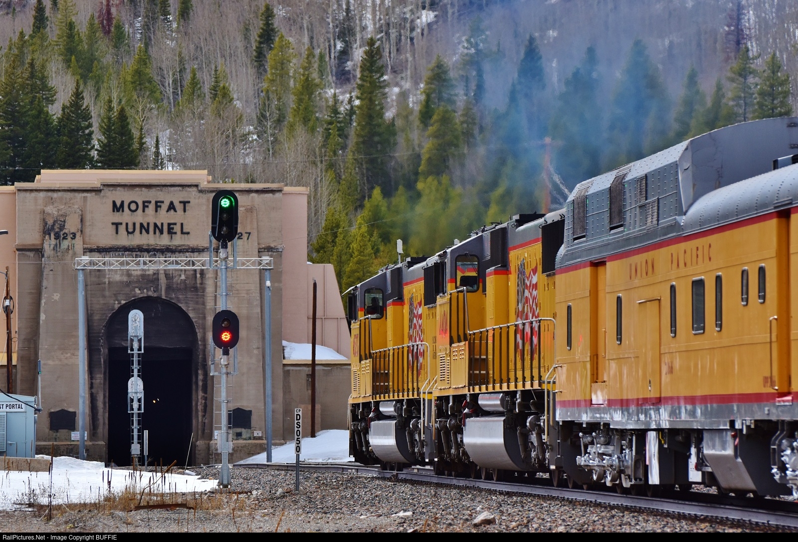 A Union Pacific officer's special gets the green to enter the east portal of the Moffat Tunnel at Tolland, Colorado.