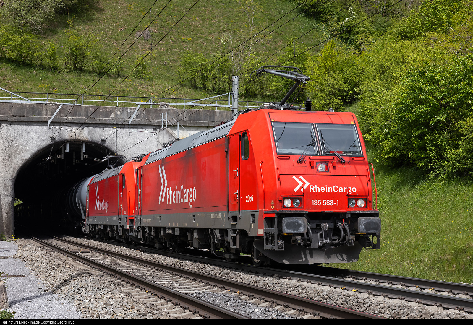 | Bombardier TRAXX F140 AC2 185 # 588 and # 587 of the Rhein Cargo in multiple control, rented from the AKIEM leasing compagny, are pulling the empty tank car train 48644 from Glattbrugg via Regensdorf-Bözberg-Basel to Flörsheim/Germany, leaving the Villnachern tunnel between Brugg AG and Schinznach Dorf. |