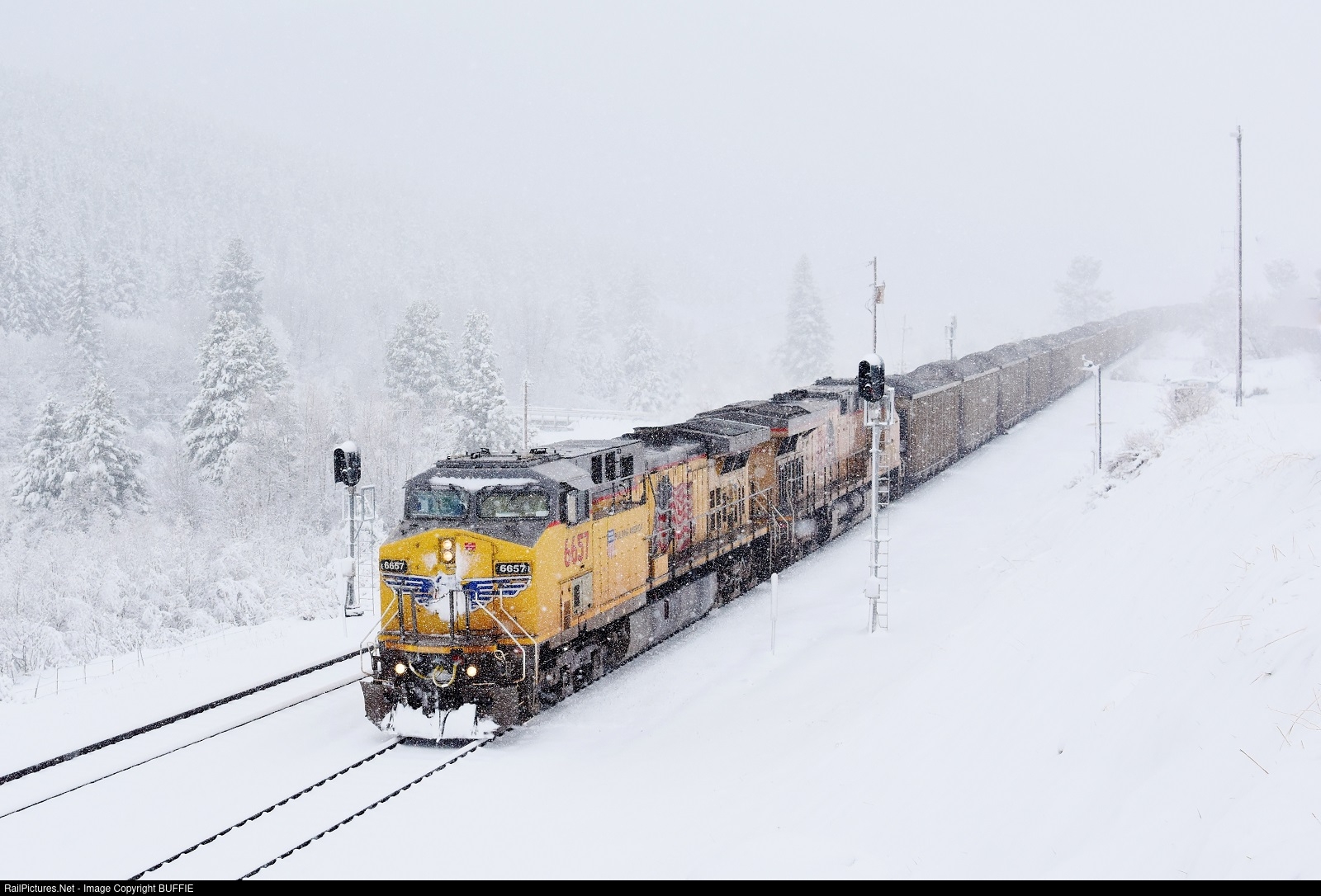 A winged UP 6657 (AC4400CW) leads a loaded coal train in heavy snow through the signals at Rollinsville, Colorado as it heads down the mountain towards Denver.