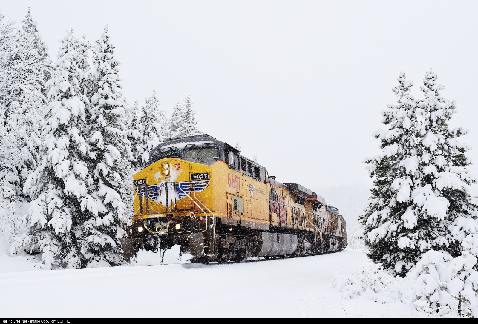 | Wet, heavy snow from a spring storm is falling on the Moffat Tunnel Sub as UP 6657 (AC4400CW) runs towards Pinecliffe, Colorado while leading a loaded coal train for Denver. |