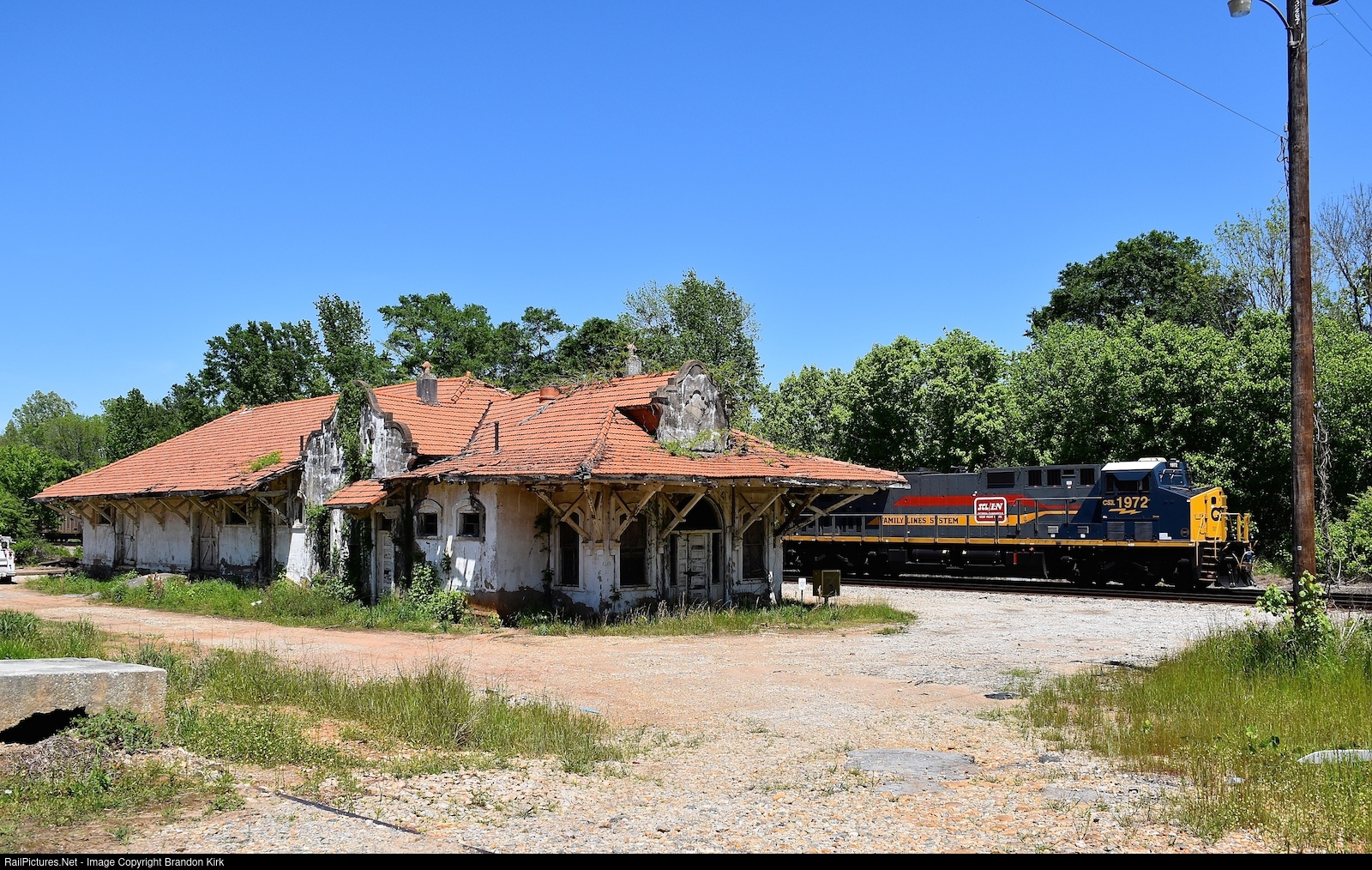 One of the twelve new heritage units that CSX has been painting lately, gives this empty hooper train a shove on its way for more coal. The Family Lines unit rolls by the historic Wadley Depot train station that was built in 1907.