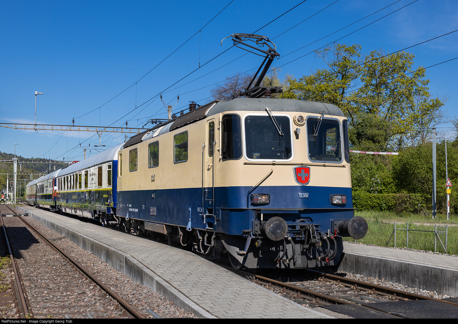 | The Swiss Railwaymen Travel Association (SERV) Winterthur section celebrated its 75th anniversary on this day. A special train with the 3 luxurious PRESTIGE CONTINENTAL EXPRESS coaches (two dining cars "Le Salon Bleu" and "Le Rubis Noir" and a piano bar car "Le Diamant Bar") pulled by the matching Re 421 # 387 (Re 4/4 II # 11387) of IRSI, formerly SBB, ran for the members. The train from Winterthur via Bülach-Eglisau-Schaffhausen-Kreuzlingen-Romanshorn-St.Gallen-Wattwil-Wil SG back to Winterthur-Bülach-Schaffhausen makes a stop at the small station of Schlatt on the Schaffhausen-Stein am Rhein line. The trip was organized by RailEvent and operated by the railroad company TR TransRail.
