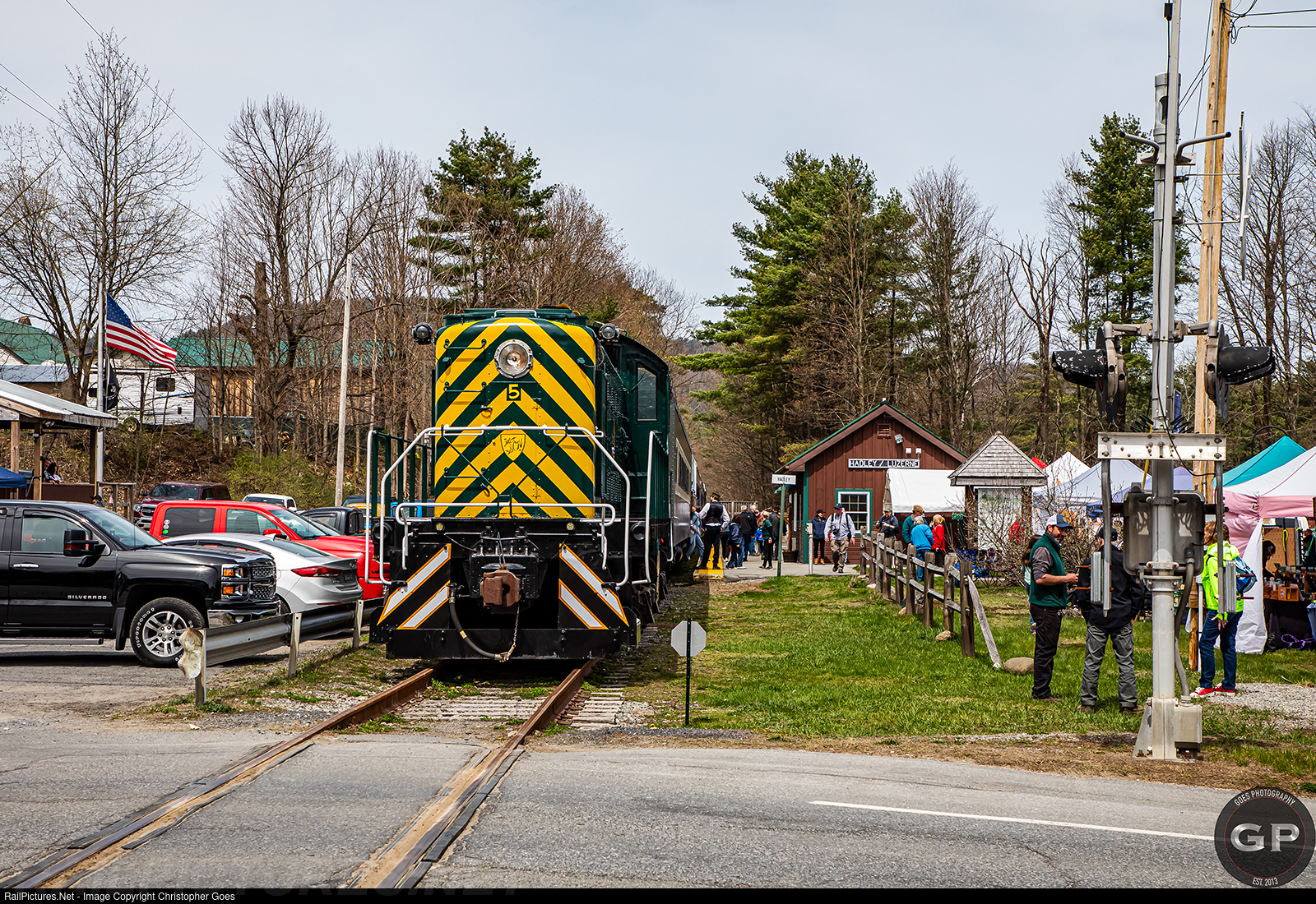 The Hadley Express has just arrived at Hadley/Luzerne Station on it's second run of the day dropping off passengers for the "Maple in April" Festival featuring SC&H ALCO 5