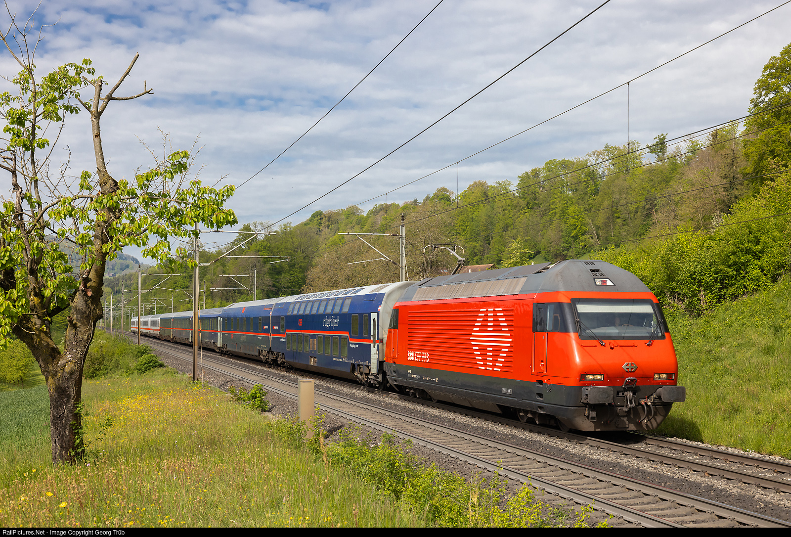 Re 460 # 116 ôf the SBB pulls the NightJet 471 from Hamburg Altona to Zürich, on the Bözberg south ramp near Umiken, between Villnachern and Brugg VL. The train was rerouted from the Hauenstein line via Bözberg-Brugg VL-Lupfig-Mägenwil joint line-Heitersberg tunnel to Zürich. In the consist are bed cars WLBmz, WLABmz, couchette cars Bbcmvz and Bcmz, seat car Bmz of the ÖBB and 4 seat cars of the Deutsche Bahn in the rear.