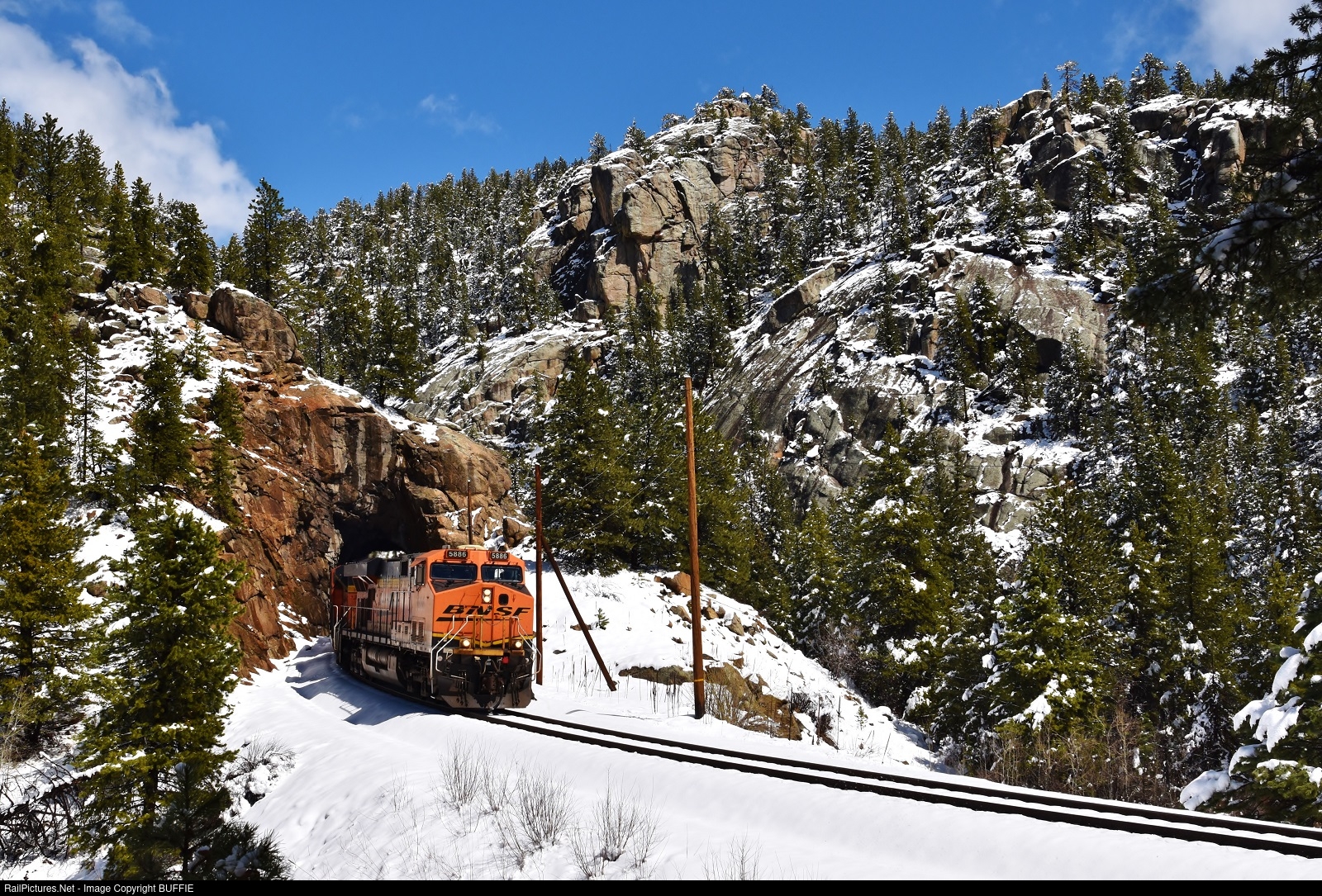 BNSF 5866 (ES44AC) exist Tunnel #29 at Pinecliffe, Colorado and will continue down the mountain towards Denver on the Moffat Tunnel Sub.