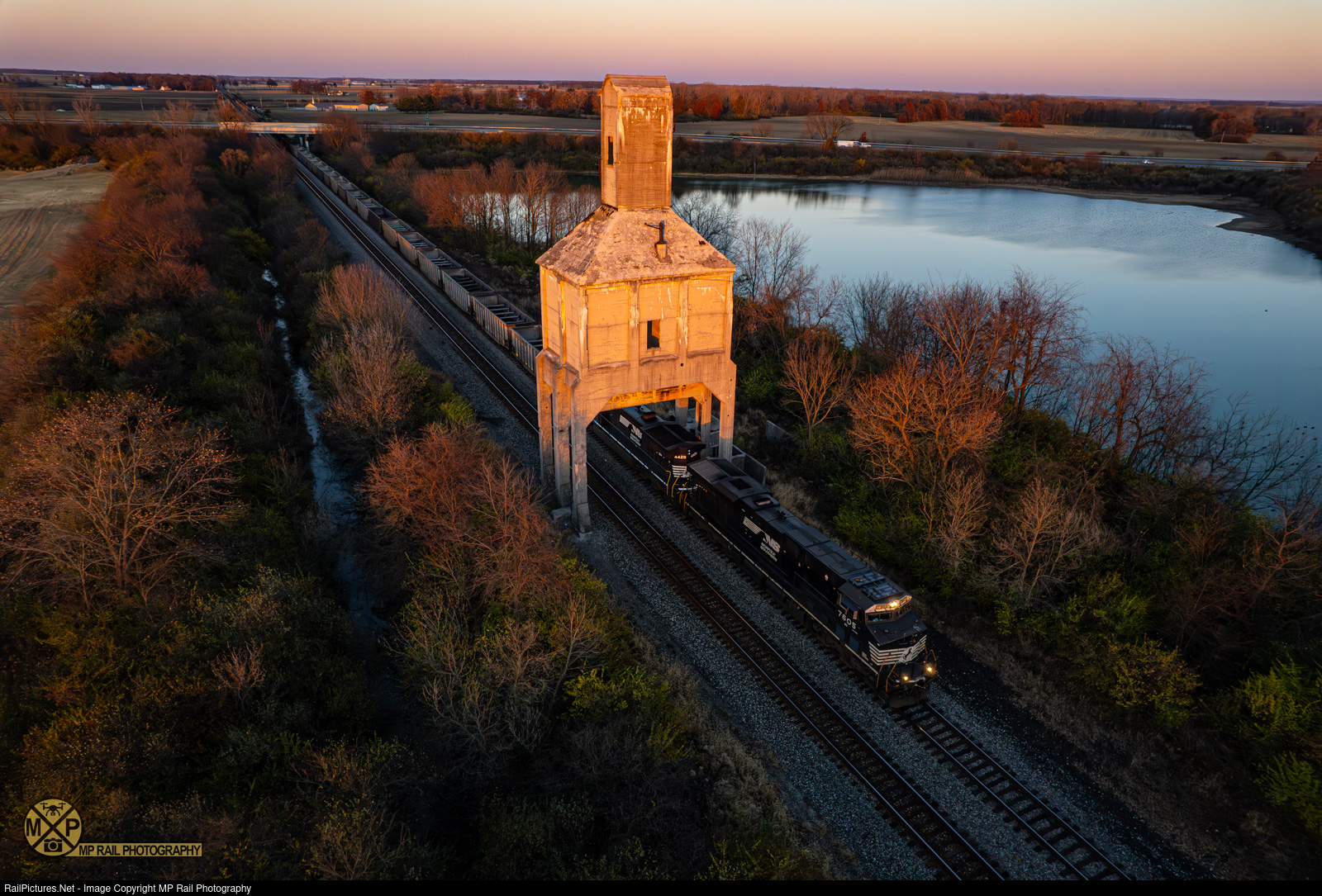 NS 777 passes under the former Pennsylvania Railroad Coaling Tower as the sun sets over Marion.