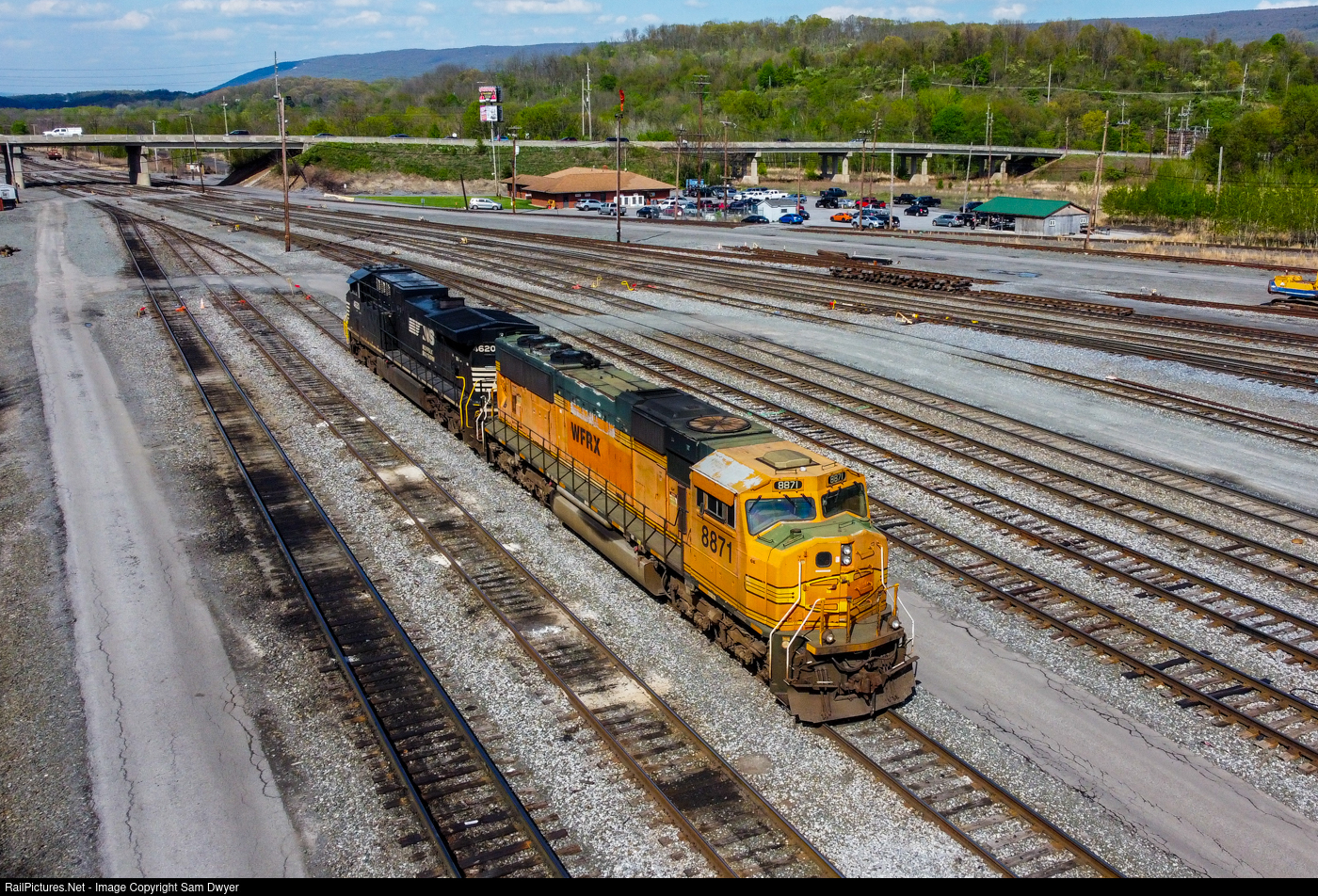 WFRX 8871 is one of 30 former BNSF SD70MACs leased by Norfolk Southern to help with its recent power shortage. Word on the street is that these units will soon be returning to their owner, Wells Fargo Rail in the near future. Since none of these units are equipped with PTC, they're usually seen trailing on trains, but when cut off from it's train, 8871 sits nose-out in the sun.