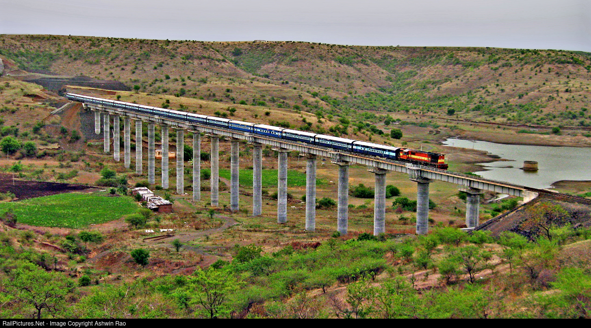 17014 Hyderabad Deccan Pune Express via Osmanabad over long Bridge near Gad Deodari towed by Pune WDM3d, Maharashtra, Osmanabad.