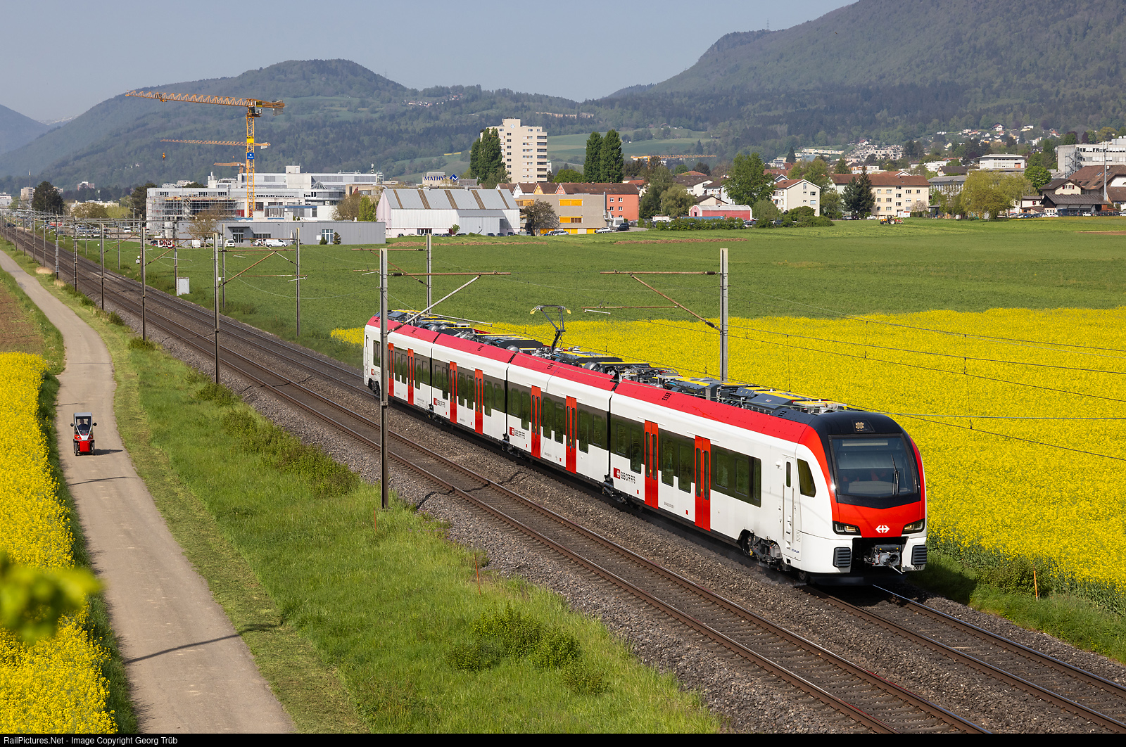 | New "Flirt Evo" RABe 531 # 001 from StadlerRail for the SBB on the test run 97243 from Grenchen Süd to Solothurn, between Bettlach and Selzach. There were brake tests from maximum velocity to standstill. The line allows 160 km/h, and 10 % more for tests. The SBB ordered 286 of this type in different versions, including trains for daughters RegionAlps and Thurbo. |