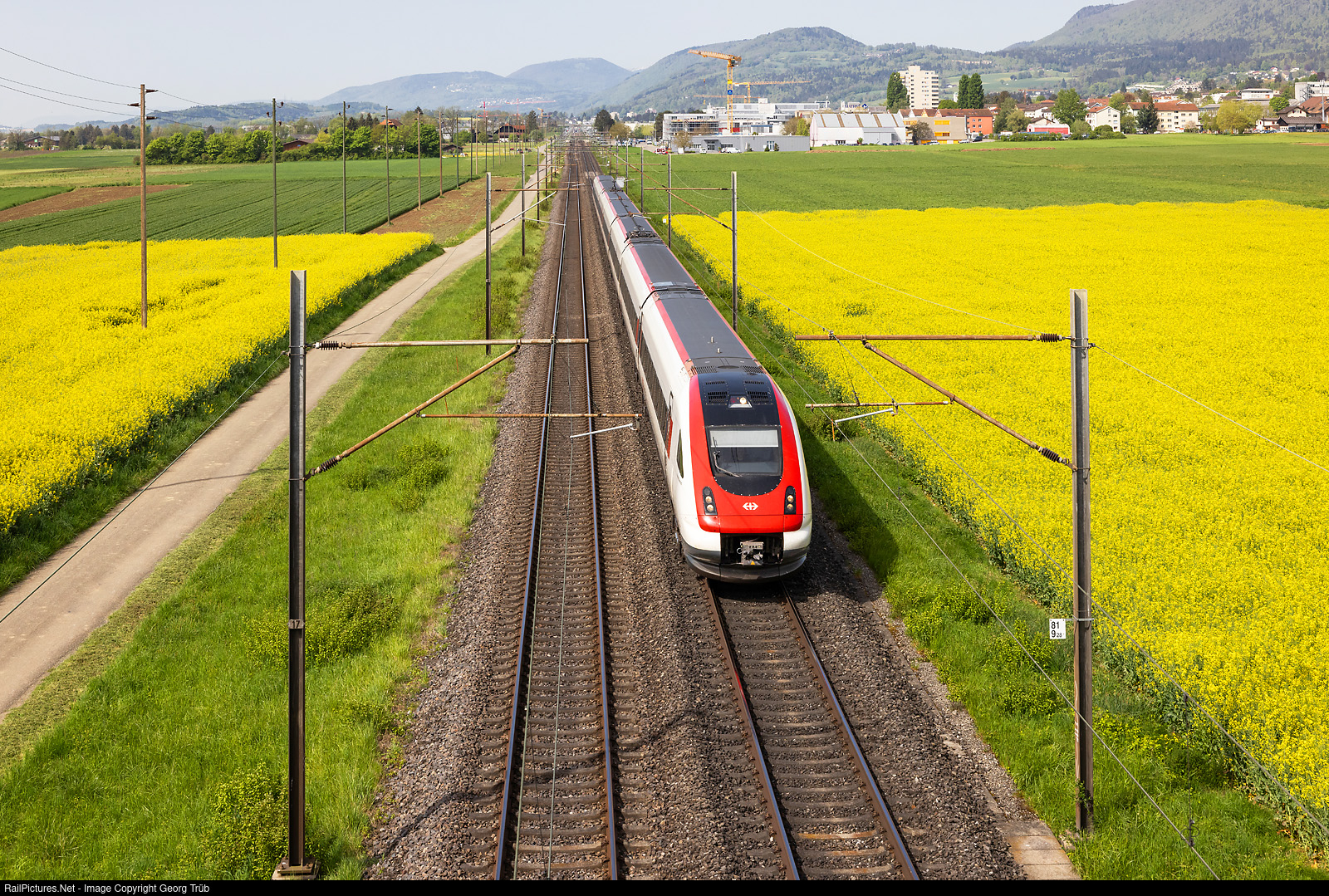 | Intercity tilting train ICN RABDe 500 # 009 of the SBB, with open coupling, is running the IC 517 of the line IC5 across Switzerland from Geneva Airport via Yverdon-les-Bains-Neuchâtel-Biel-Olten-Zürich-Winterthur-St.Gallen to Rorschach, with 160 km/h on the Jura south foot mainline between Bettlach and Selzach. |