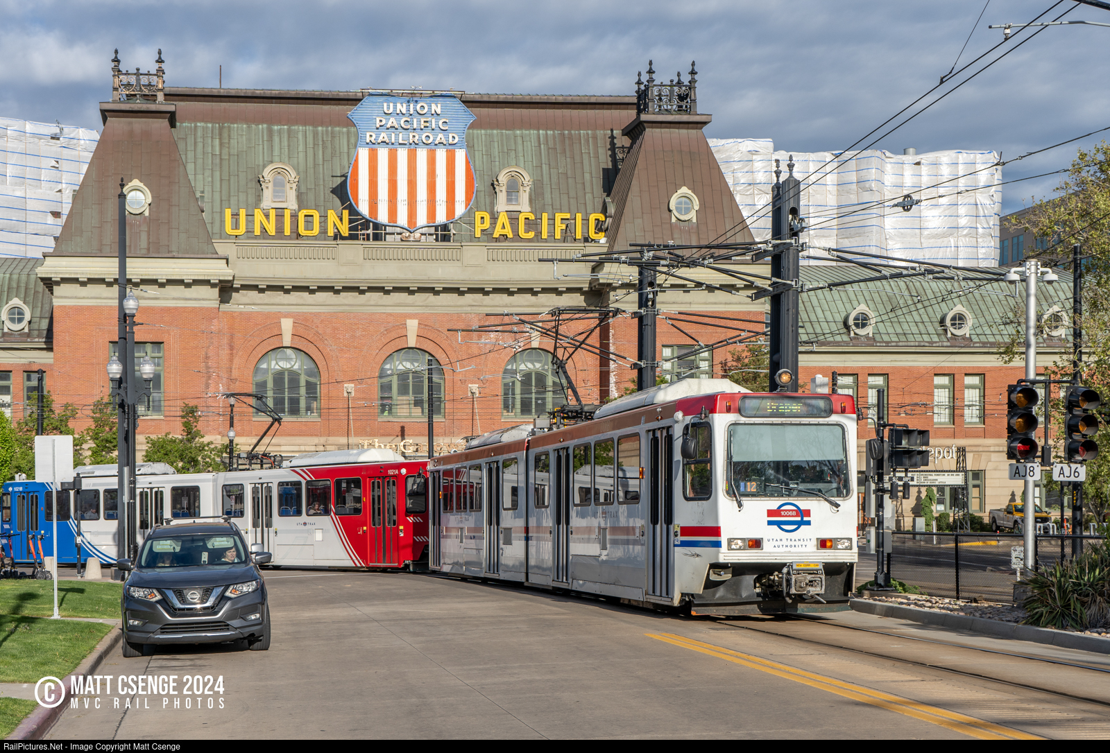 Utah Transit Authority (UTA) SD-100 LRV no. 1006 is the lead unit on a TRAX Blue Line train seen rounding the corner at S Temple / N 400 W, with the former Salt Lake City Union Pacific Depot standing tall in the background. The station was built in 1908-09 and served passenger trains until 1986, when Amtrak moved to the Denver & Rio Grande Western Depot after that railroad joined Amtrak. Nowadays the majority of the building is used for other purposes, but UP still maintains some offices and training rooms within. |