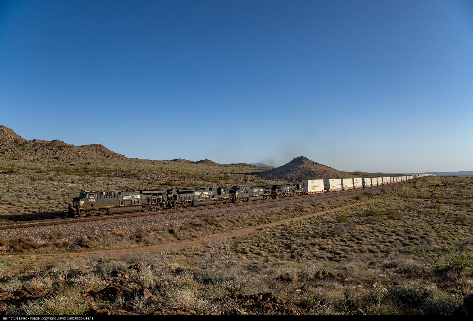 Four Norfolk Southern locomotives lead the San Bernardino, CA to Austell, GA (via NS interchange at Memphis, TN) Z-train as they charge out of Walapai and round the curve of Antares. Normally, the westbound version of this train (Z-AUGSBD) consist of a solid NS locomotive consist. Once in San Bernardino, those NS motors get turned onto the Z-SBDAUG, but they're usually trailing behind BNSF motors. Seeing an eastbound train with a solid consist of NS locomotives is quite rare for the BNSF transcon.