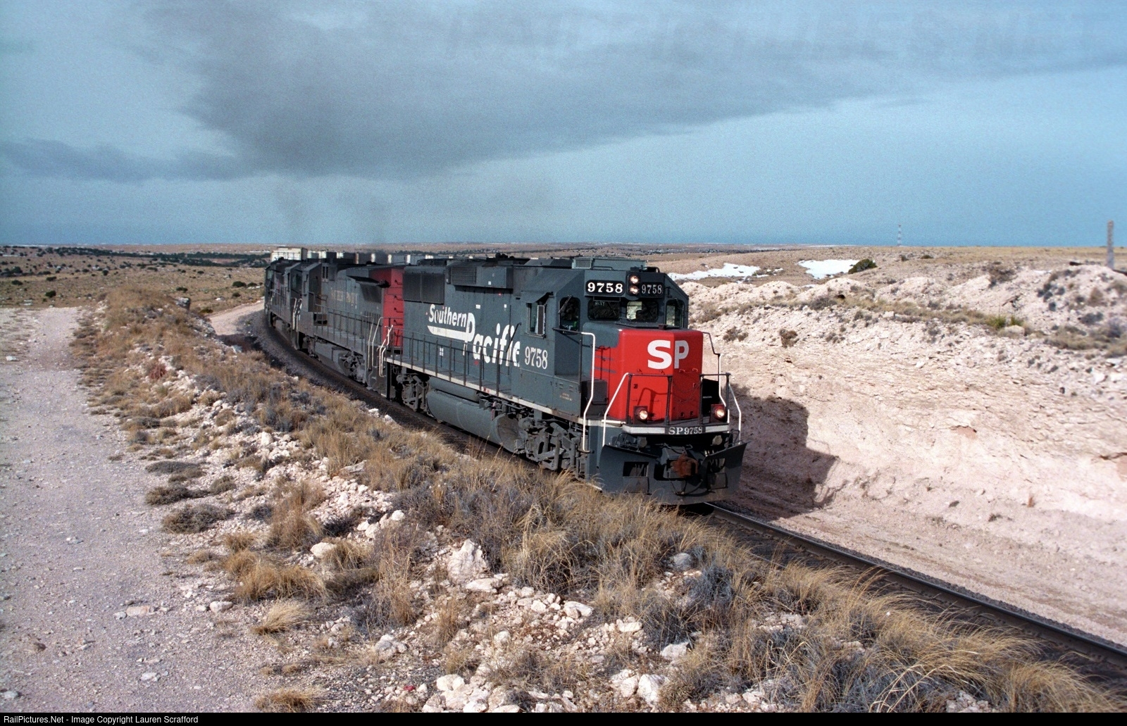 Southern Pacific 9758 E/B Intermodal just east of Duran, NM on the Golden State Route on December 16, 1995 with SP 8037 and another SP B39-8E. Storm clouds on the horizon with more snow later in the day.