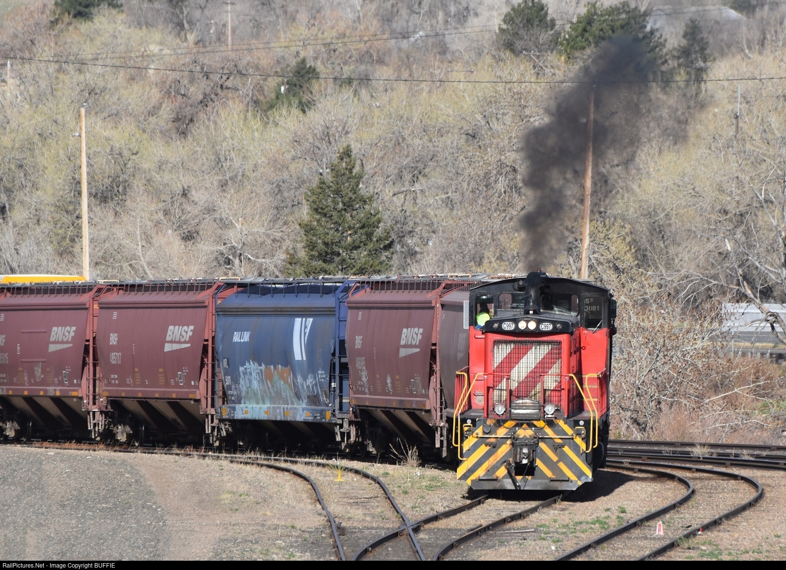 Coors Brewing Critter #997 (SW1000) makes smoke as it strains to move a cut of grain hoppers in the yard in Golden, Colorado.