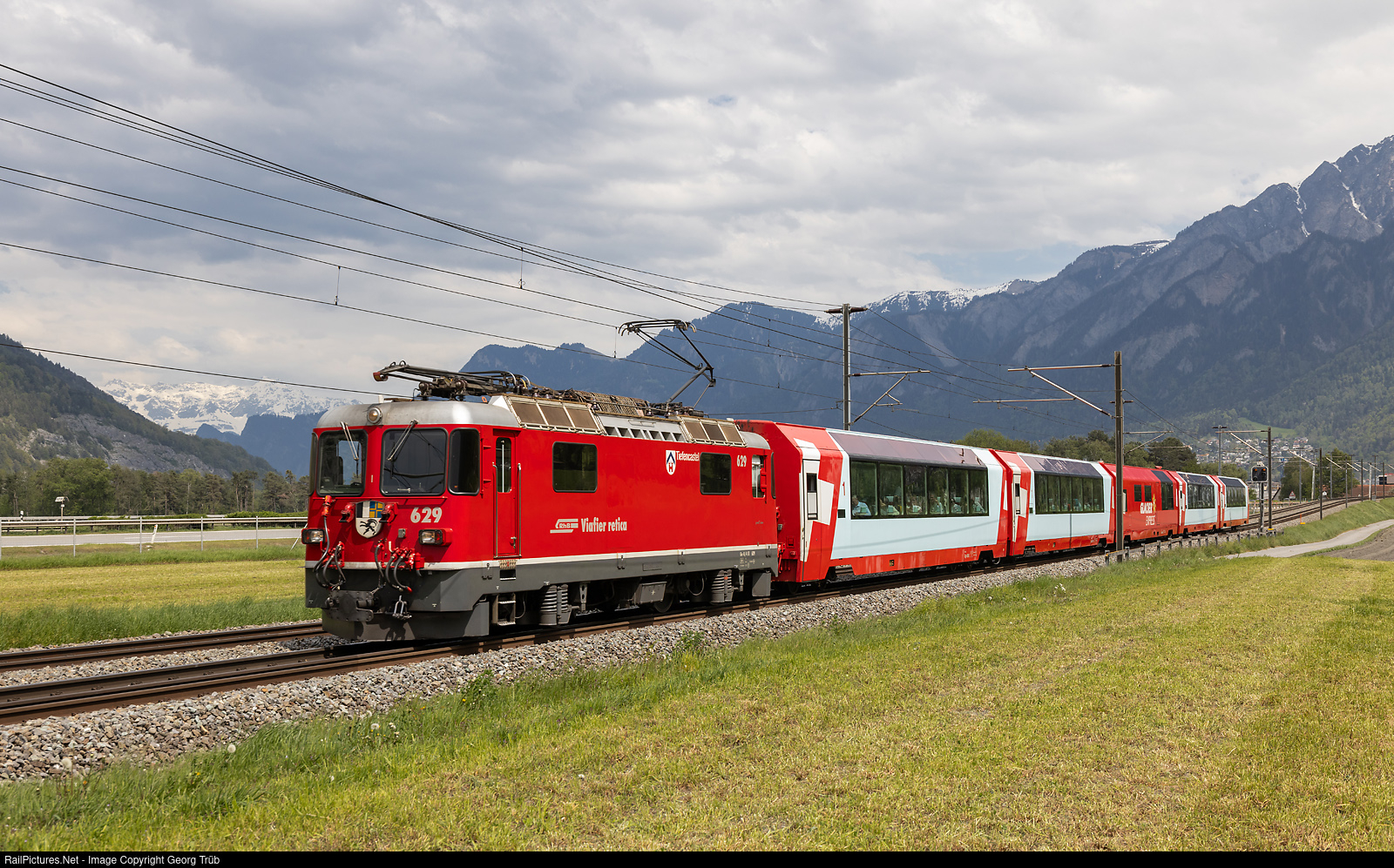 | Ge 4/4 II # 629 of the Rhaetian Railway pulls the PE 920 GLACIER EXPRESS Zermatt-St.Moritz on the lap from Chur over the Albula line to St.Moritz, between Chur and Felsberg. |