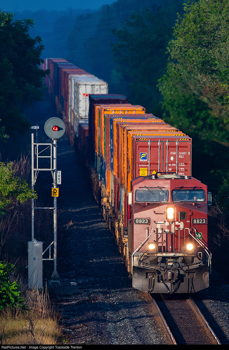 | The days are getting shorter however the sun still rises early as CP 8823 emerges from the shadows into brilliant morning sunshine approaching Trenton. |