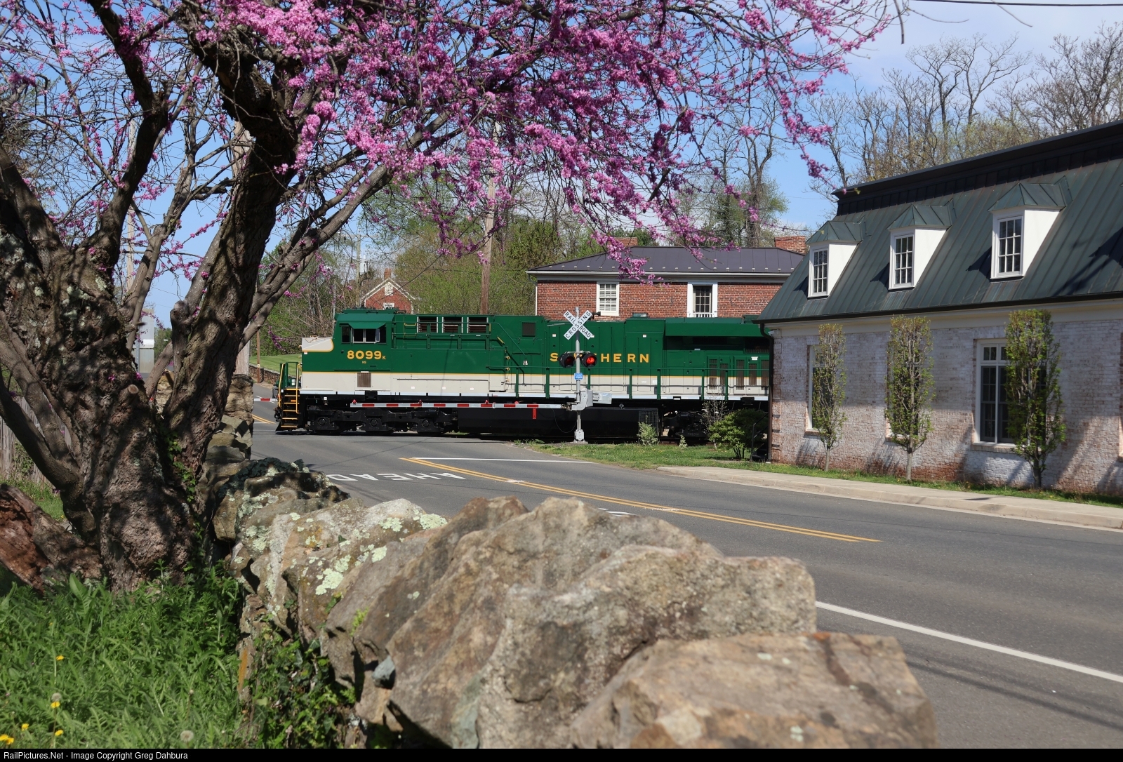 NS 8099, the "Southern" heritage unit, shoots through The Plains, Virginia on the return trip from the Masters Tournament in Augusta, Georgia.