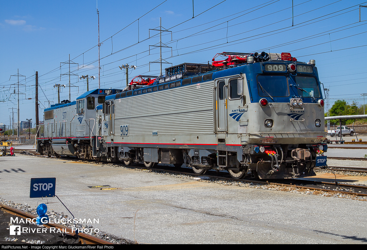 With Just A little Paint. AMTK 909 (AEM-7, EMD/ASEA, 10/1980) was not one of the "toasters" selected for upgrade to AC electronics, but was repainted, and looks fairly respectable for a 33-year old that has been in daily service for all of its life. On May 5, 2013, it is seen with AMTK 577 (GP15D, MPI, 2004) sitting outside of the Amtrak Wilmington, Delaware shops, where diesel switchers are used to move the electric motors around the yard. In a little over 3 years in 2016, the AEM-7s would be retired by Amtrak, in 2017 by MARC, and in 2018 by SEPTA.