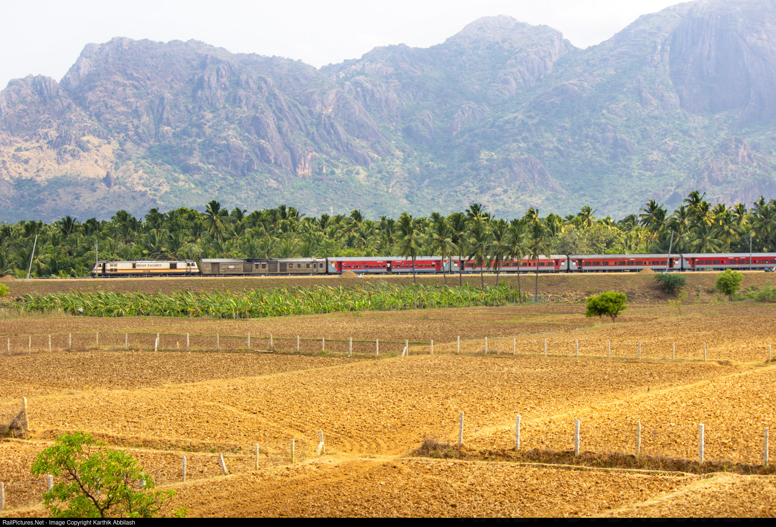| PUNE WAP-7 in charge of slightly late running Mumbai CSMT Nagercoil Jn express skips the Tovalai region surrounded by Western Ghat mountains. |