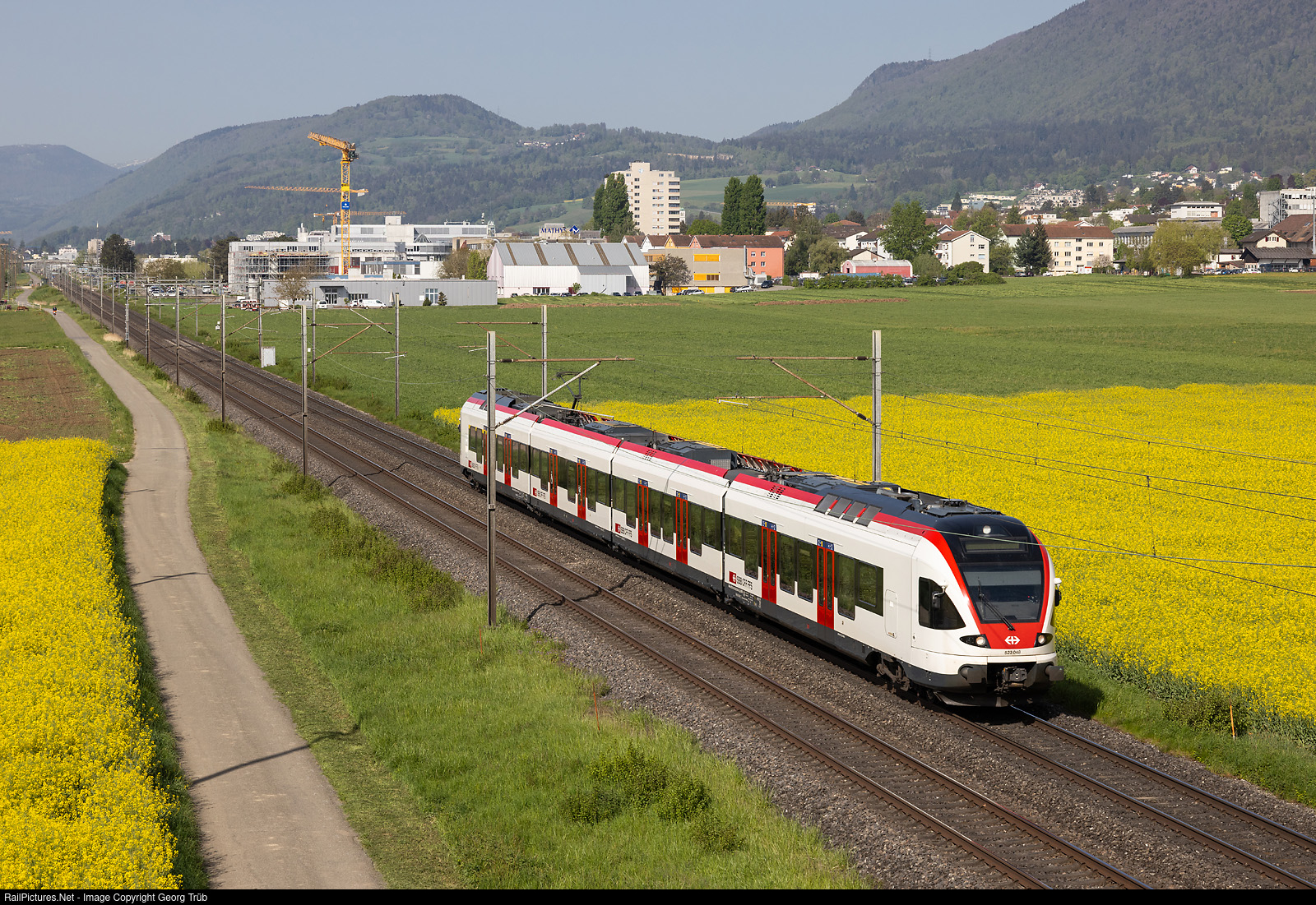 | "Flirt" regional train RABe 523 # 048 of the SBB is running the S20 service 7665 from Biel via Solothurn to Olten, between Bettlach and Selzach. |