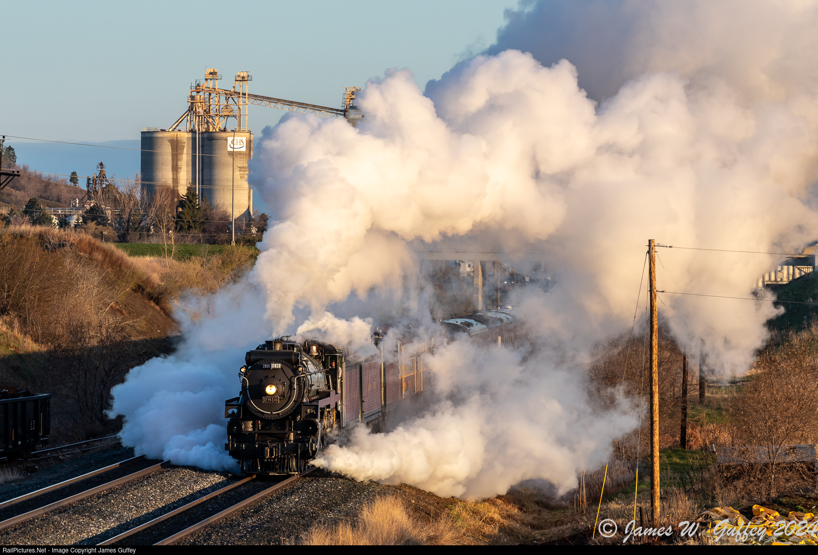 2816 gets underway at Minot on the 320-mile run to Glenwood, MN that will involve by my count six meets with oncoming trains and four maintenance stops, making for more than a full day.