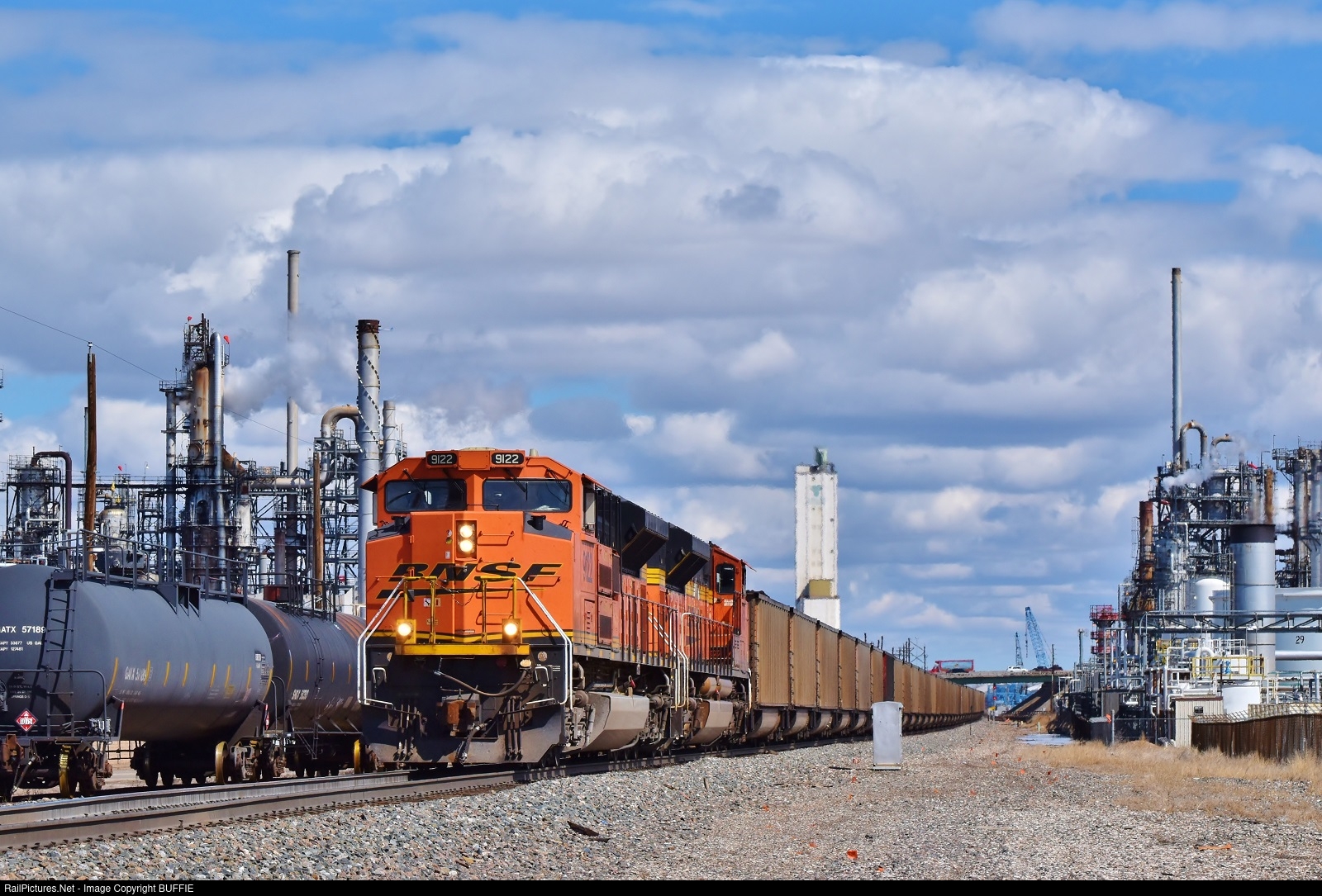 BNSF 9122 (SD70ACe) leads a coal train through the refineries in Commerce City, Colorado on its way to Denver.