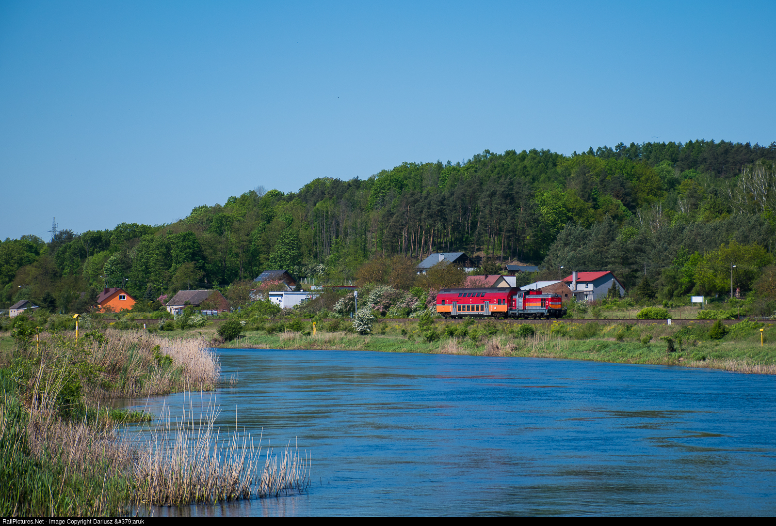 | Diesel loco SU42-501 with regional train no. 88342 from Kostrzyn to Krzy? is approaching to Nowe Drezdenko station, going along Note? river. |