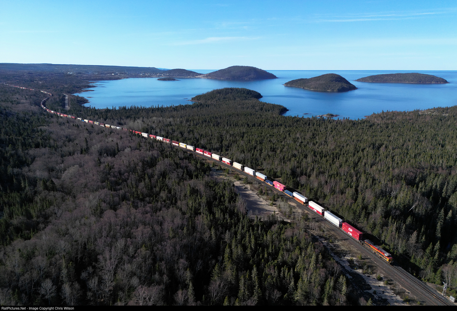 CPKC 100-03 approaches Marathon on the Heron Bay Subdivision which runs along Lake Superior as seen here twisting around Peninsula Bay.