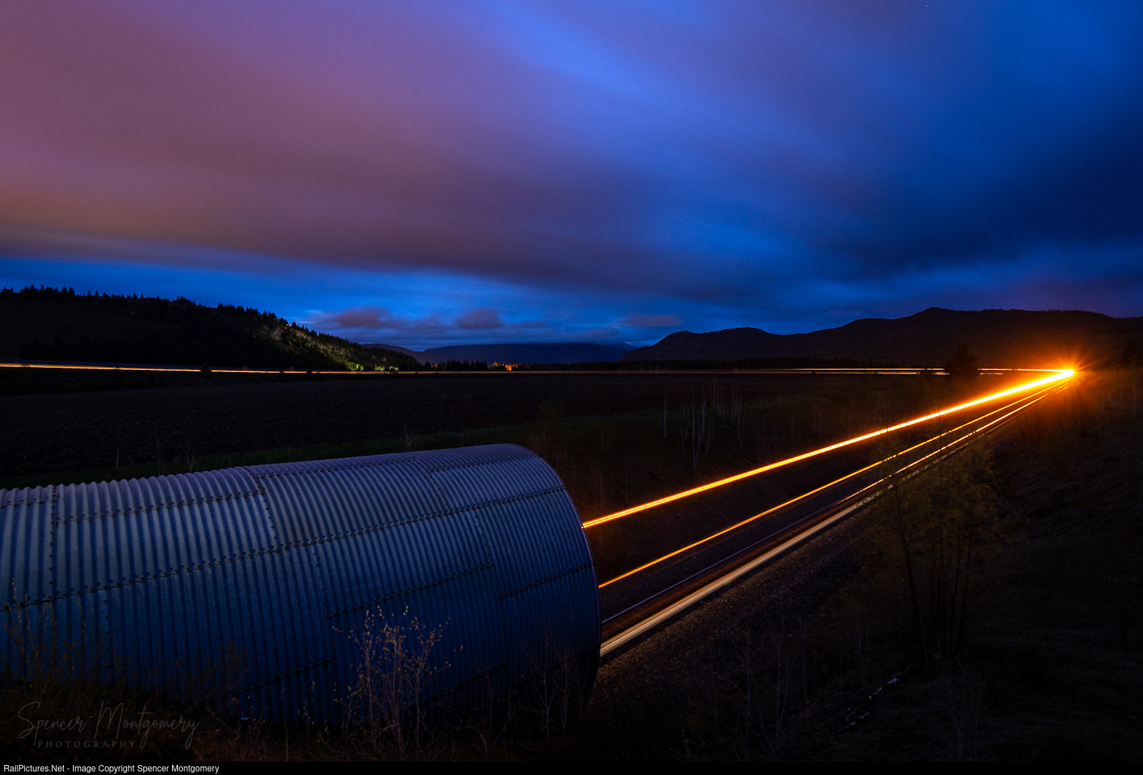 On a stormy evening, the rear remote on a grain train slowly makes its way around the horseshoe on Notch Hill.