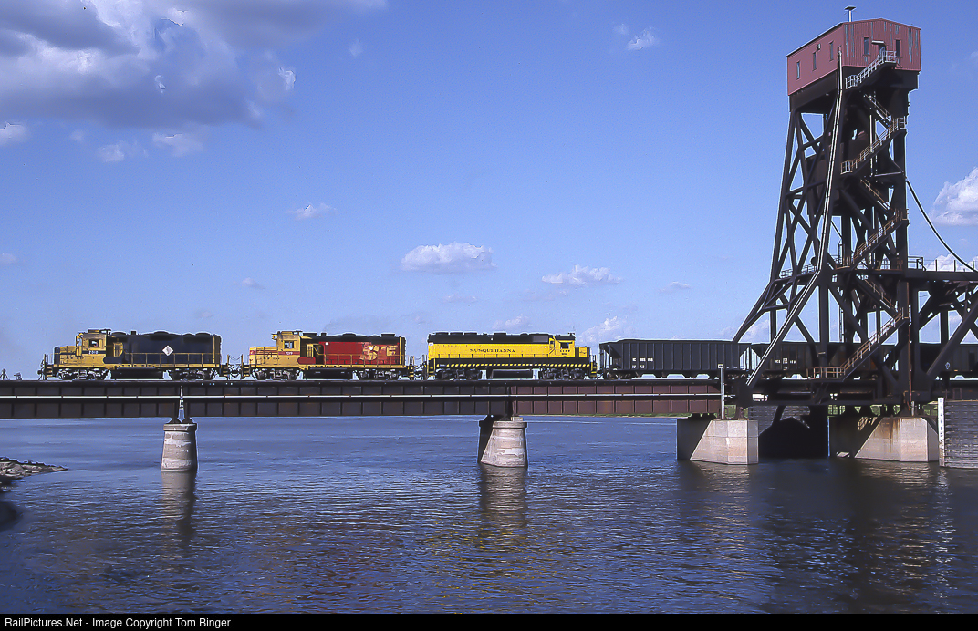 An eclectic power lashup leads a loaded coal bucket west across the Illinois River.