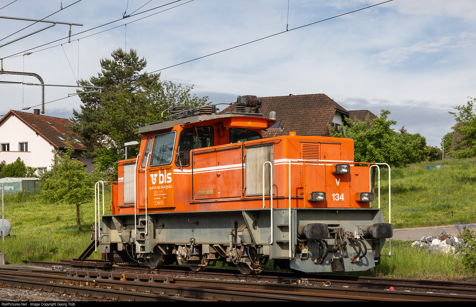 | Electric shunting locomotive Ee 936 # 134 of StadlerRail, near the commissionig center in Erlen. The locomotvie with 75 km/h maximum velocity was built by SLM and ABB in 1992 for the Emmental-Burgdorf-Thun Bahn (EBT), was then Regionalverkehr Mittellland (RM) and later BLS. StadlerRail has the similar Eea 936 # 131 and # 133 in working order, in blue paint. |