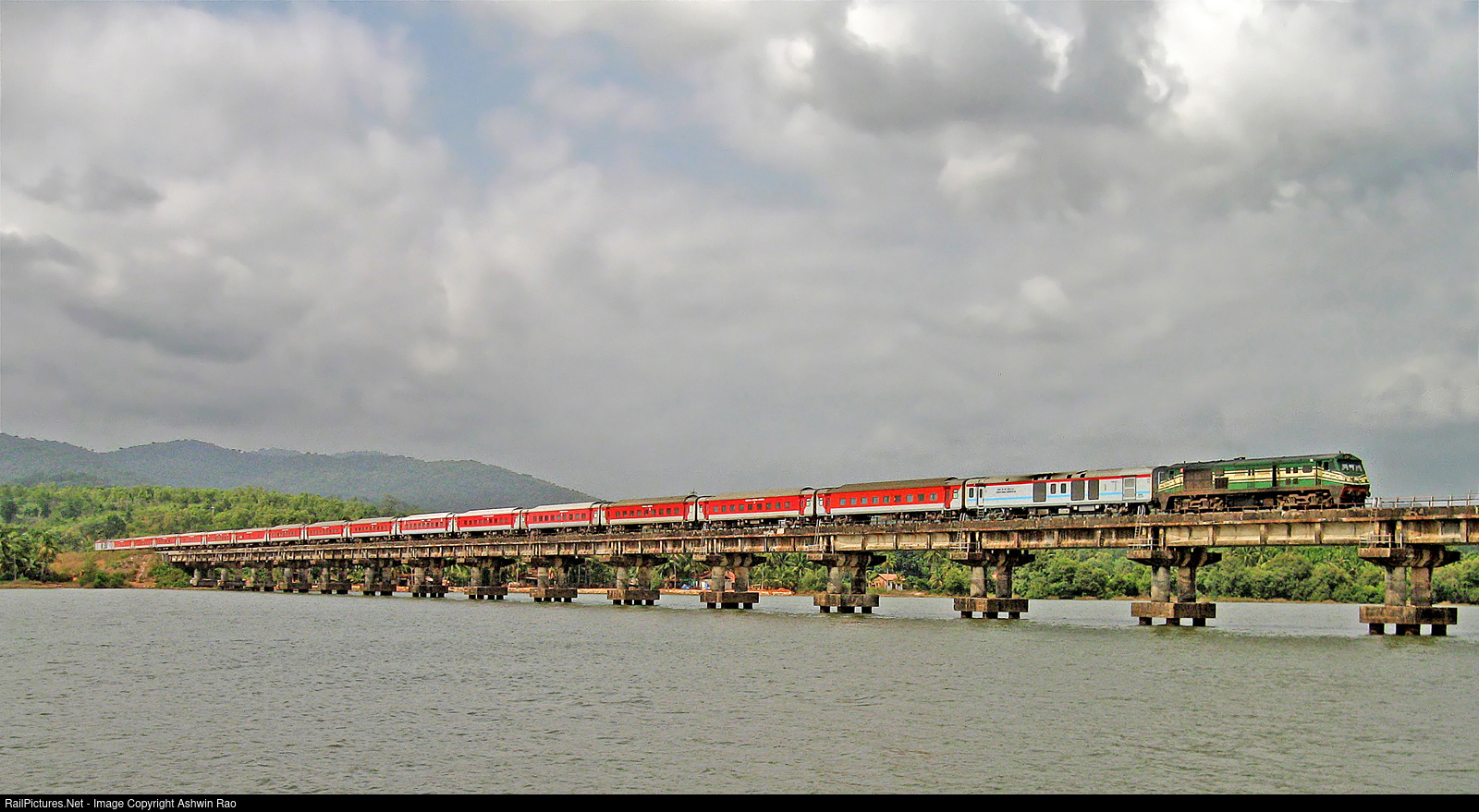 The longest running Rajdhani of India 12432 Nizamuddin Trivandrum Rajdhani covering a total distance of 3,149 km at scenic Aghanashini river bridge near Kumta under dramatic sky. Kumta, Karnataka.
