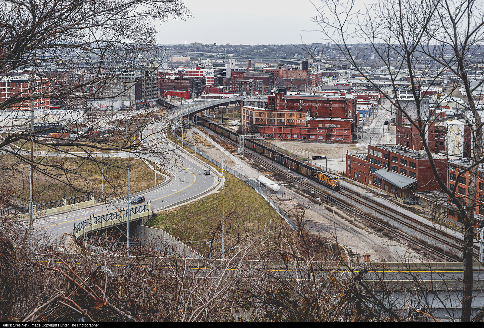 | Looking down from a city park on a bluff in Kansas City, MO on a gray Sunday, February 4, 2024 afternoon, a Union Pacific coal train is seen heading east through the West Bottoms neightborhood.