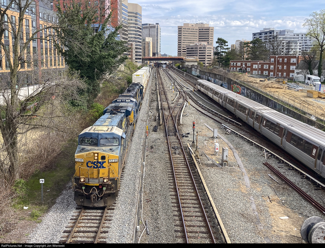 | On the afternoon of the solar eclipse, CSX 5235 and company lead a manifest northbound through downtown Silver Spring as a Metro train heads south towards the Washington. |