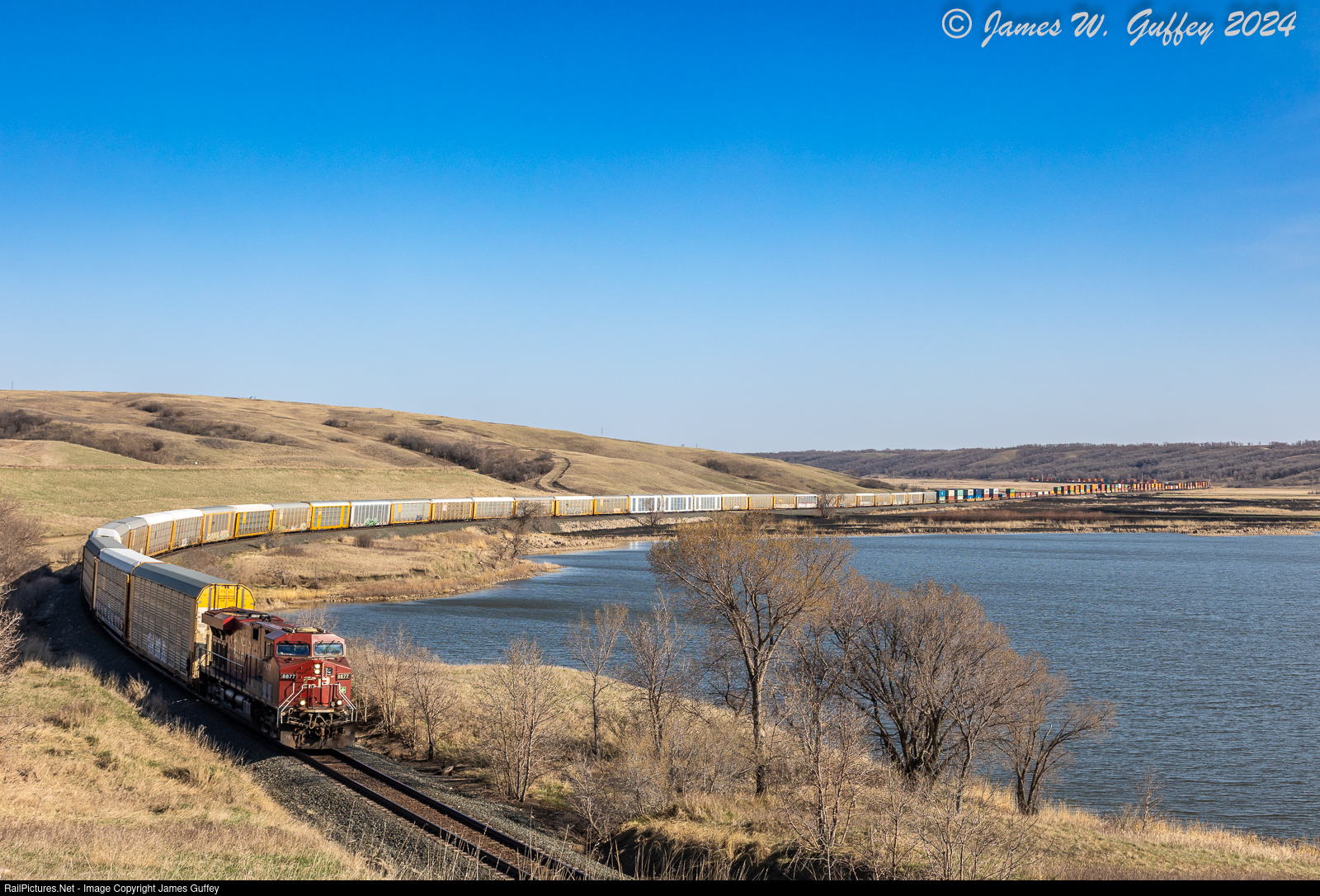 Bonus train! 2816 took a while at the border and ended up meeting 149 at Spiral, west of Kenmare. Nearly 12,000 feet of 149 is visible as it passes Middle Des Lacs Lake on the run for the border at Portal.