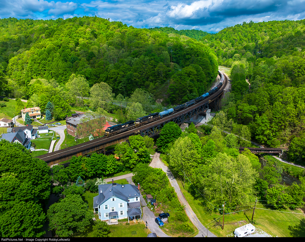 Trestle Time: NS 4086 leads manifest train NS 118 eastbound over Coopers Trestle in Bramwell, West Virginia, along the NS Pocahontas District toward Bluefield, West Virginia.