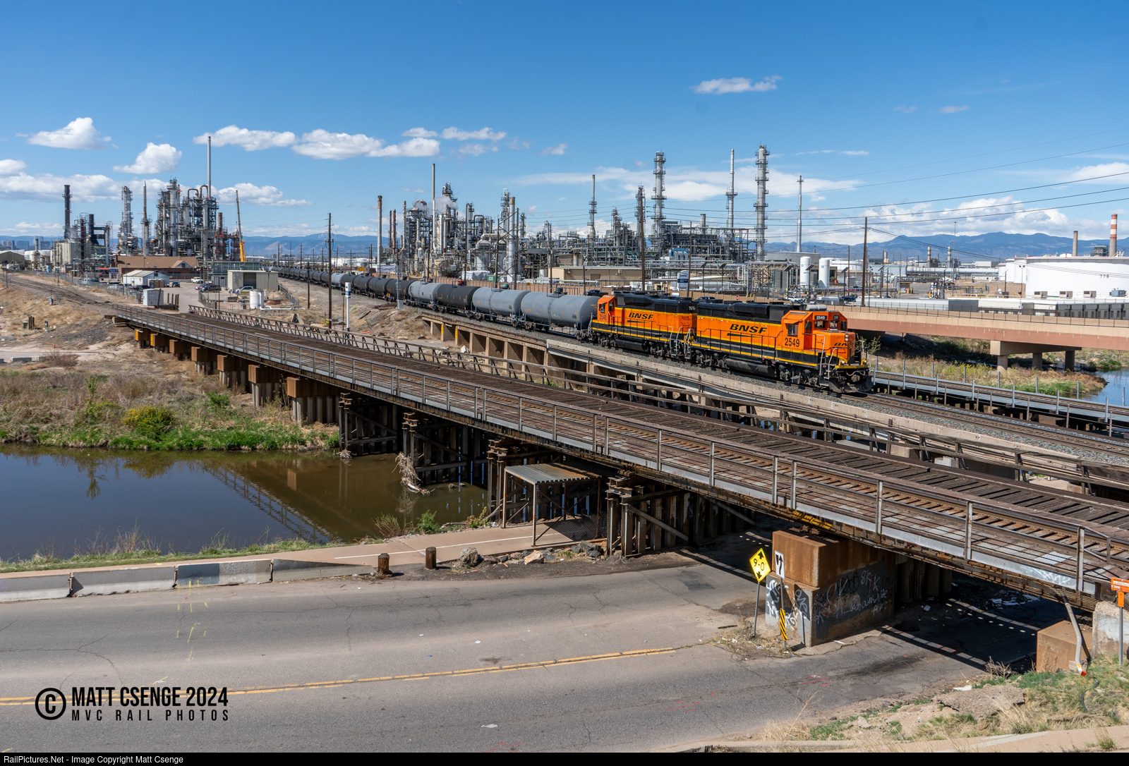 BNSF Railway GP35 no.s 2548 and 2549 lead a train across the Sand Creek, E 60th Ave, and the Colorado Front Range Trail in Commerce City, Colorado. Of the three rail bridges seen here, only one is owned by BNSF. The outer two are owned by rival Union Pacific Railroad, with the near two tracks crossing at a diamond out of frame to the right.