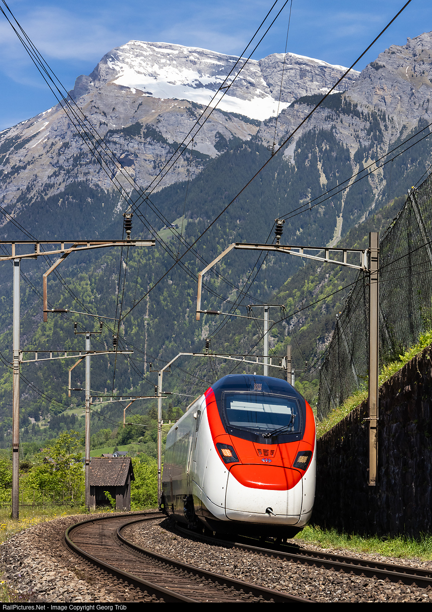 | "Giruno" highspeed trains RABe 501 # 014 "Bern" and # 028 "Jura" of the SBB in multiple control are rounding the curve at Zwing Uri fortress ruins between Amsteg-Silenen and Gurtnellen, on the Gotthard north ramp, with 2415 meter high Bälmeten above. This is the IC 671 of the line IC21 from Basel via Olten-Lucerne-Arth Goldau-Bellinzona to Lugano. |