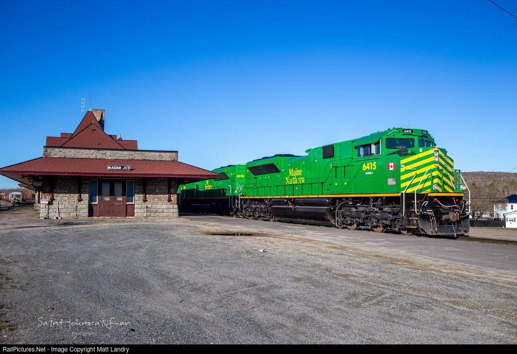| On its second mainline run since arriving on the roster, MNR 6415 leads NBSR train 120 as they pass by the station in McAdam, New Brunswick. |