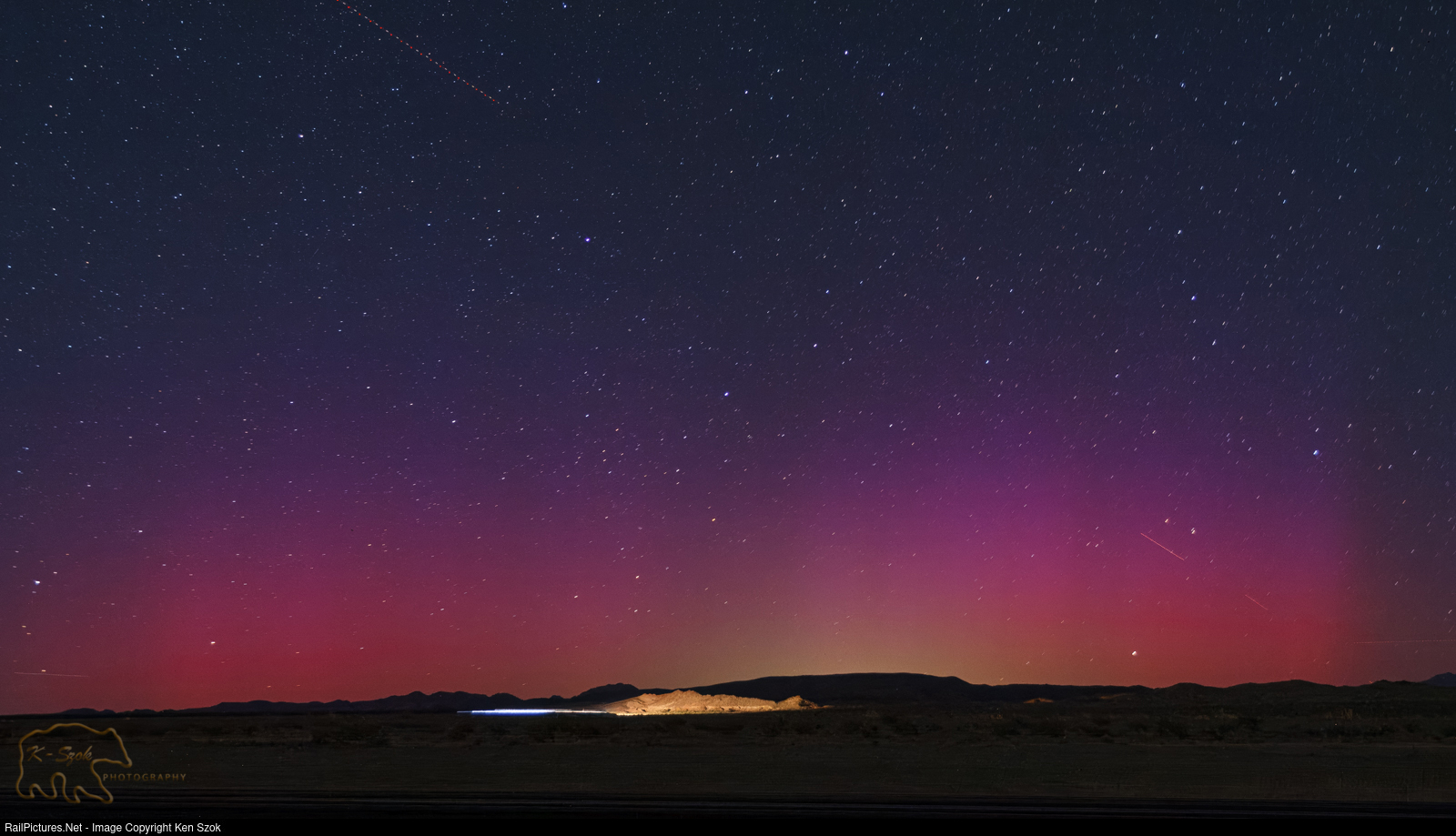 The lights of the head end of a westbound stack train light up the hill side as the train passes through Klondike on the BNSF Needles subdivision. The northern lights make a rare appearance in the California night sky.