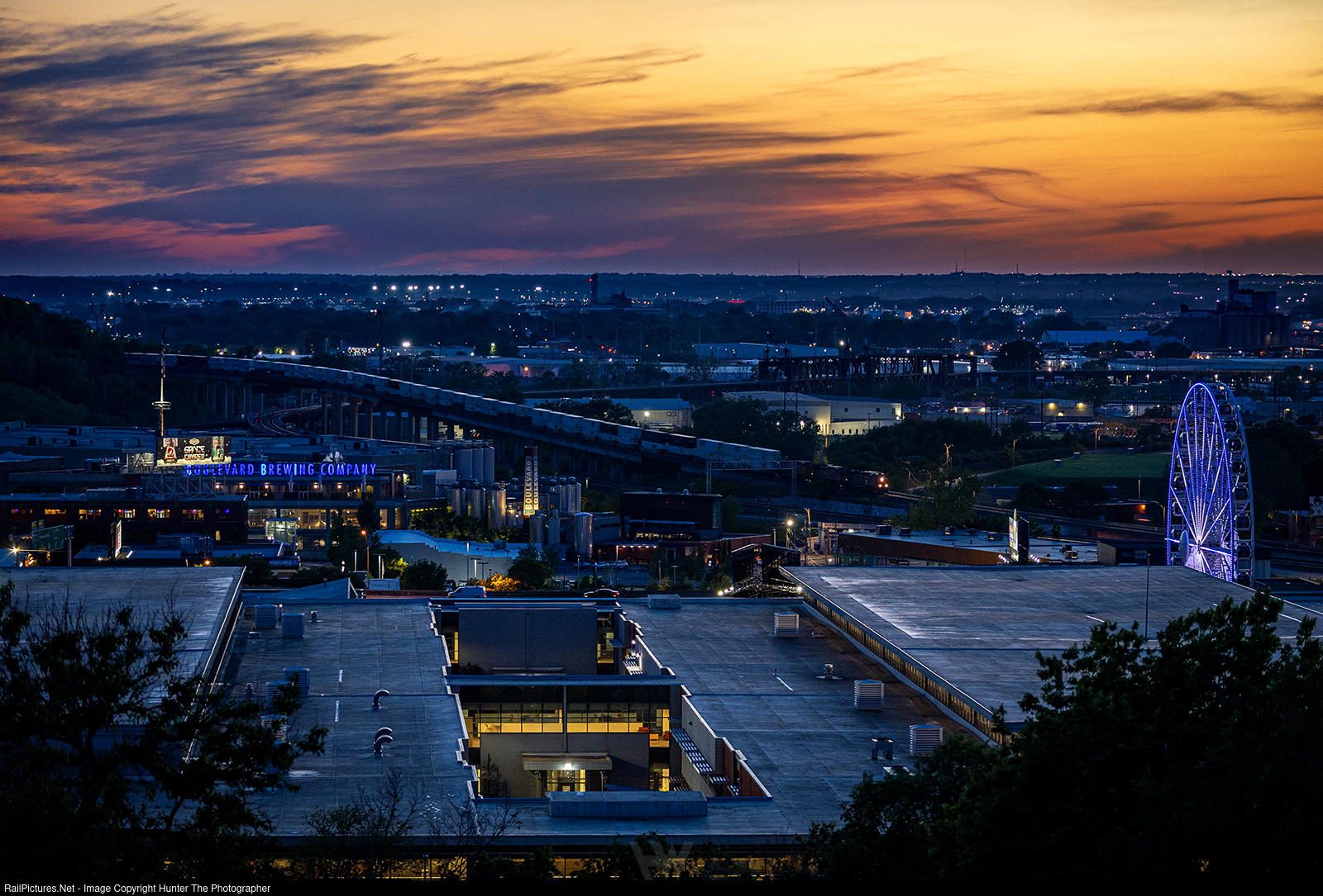 Metropolitan Landscape | Cruising across the flyover at Santa Fe Junction in Kansas City, MO on a warm Saturday, May 11, 2024 evening, an intermodal "Z" train from the Dallas-Ft. Worth area continues its journey towards Chicago. A brilliant sky sets the backdrop for the scene as night begins to fall over the city.