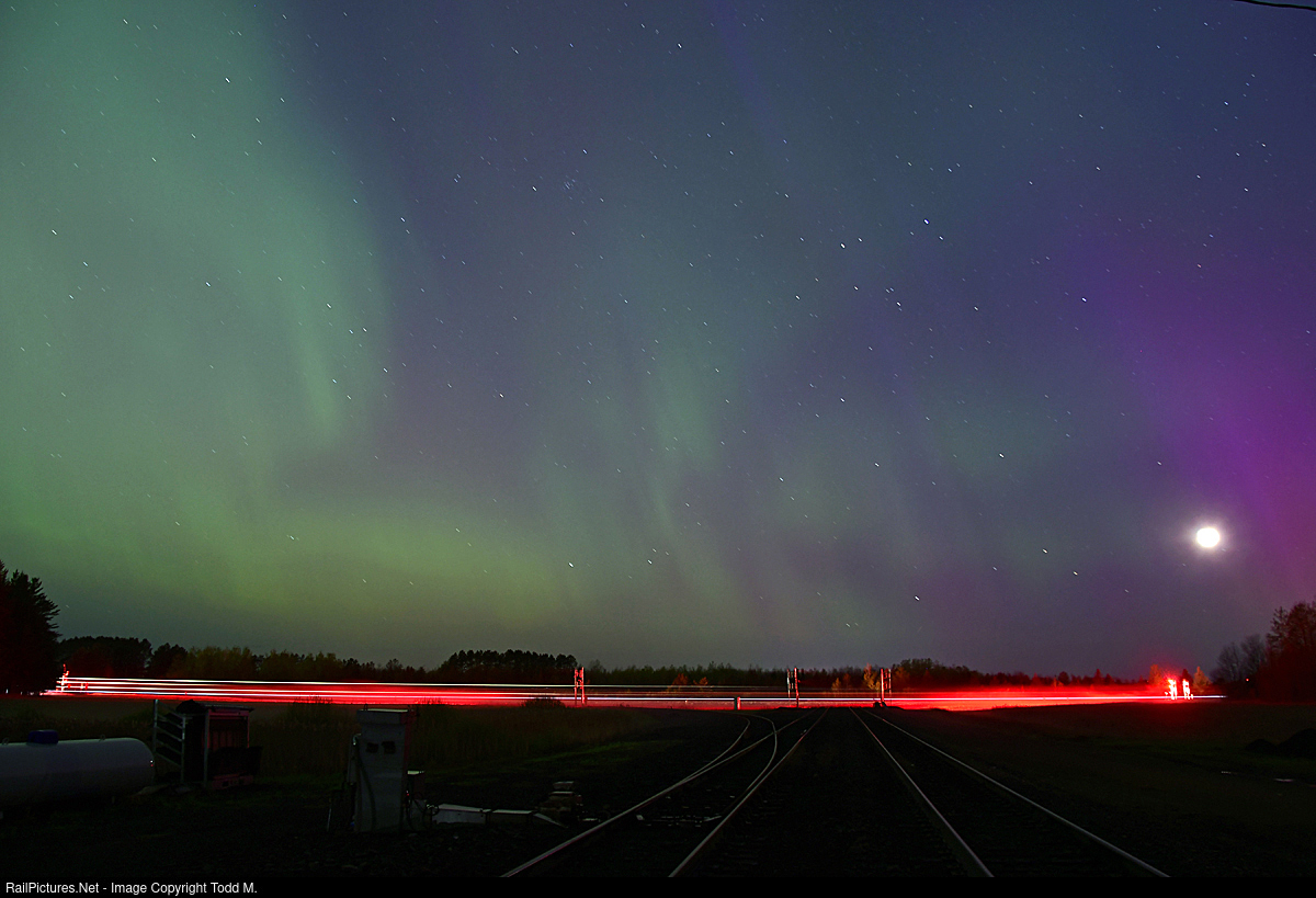 A northbound CN freight streaks up the CN Missabe through Fairlane as the aurora borealis do their thing in the sky above.