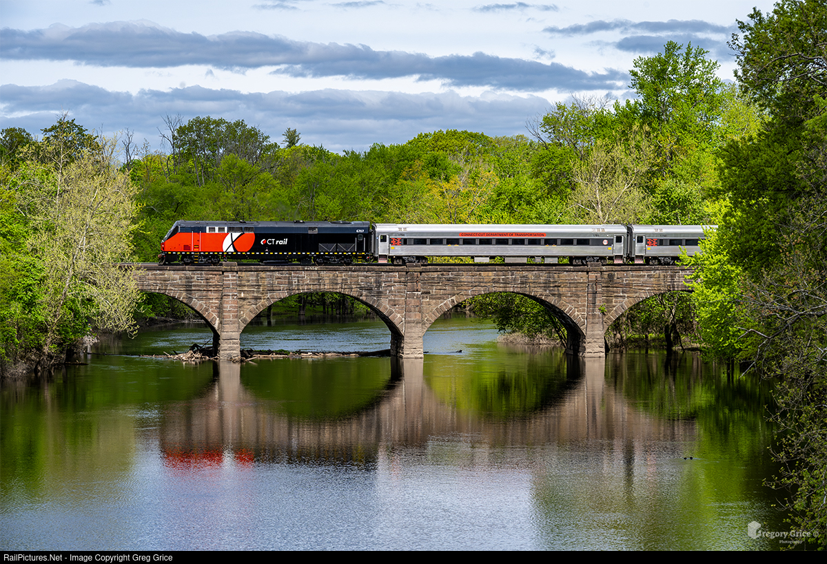 On the morning of May 10th, 2024, southbound CTrail Hartford Line train 4405, led by CTrail (CTDX) GE P40BH 6707, crosses over the Farmington River Bridge on the MRS (Hartford) Line in Windsor, Connecticut.