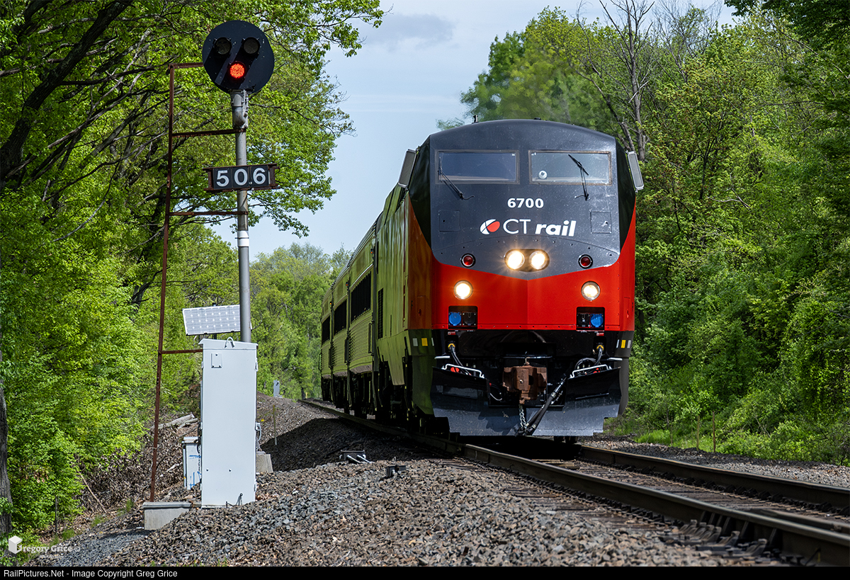 On the morning of May 10th, 2024, southbound CTrail Hartford Line train 4403, led by CTrail (CTDX) GE P40BH 6700, passes the Automatic Signal at MP 50.6 on the MRS (Hartford) Line in Enfield, Connecticut.