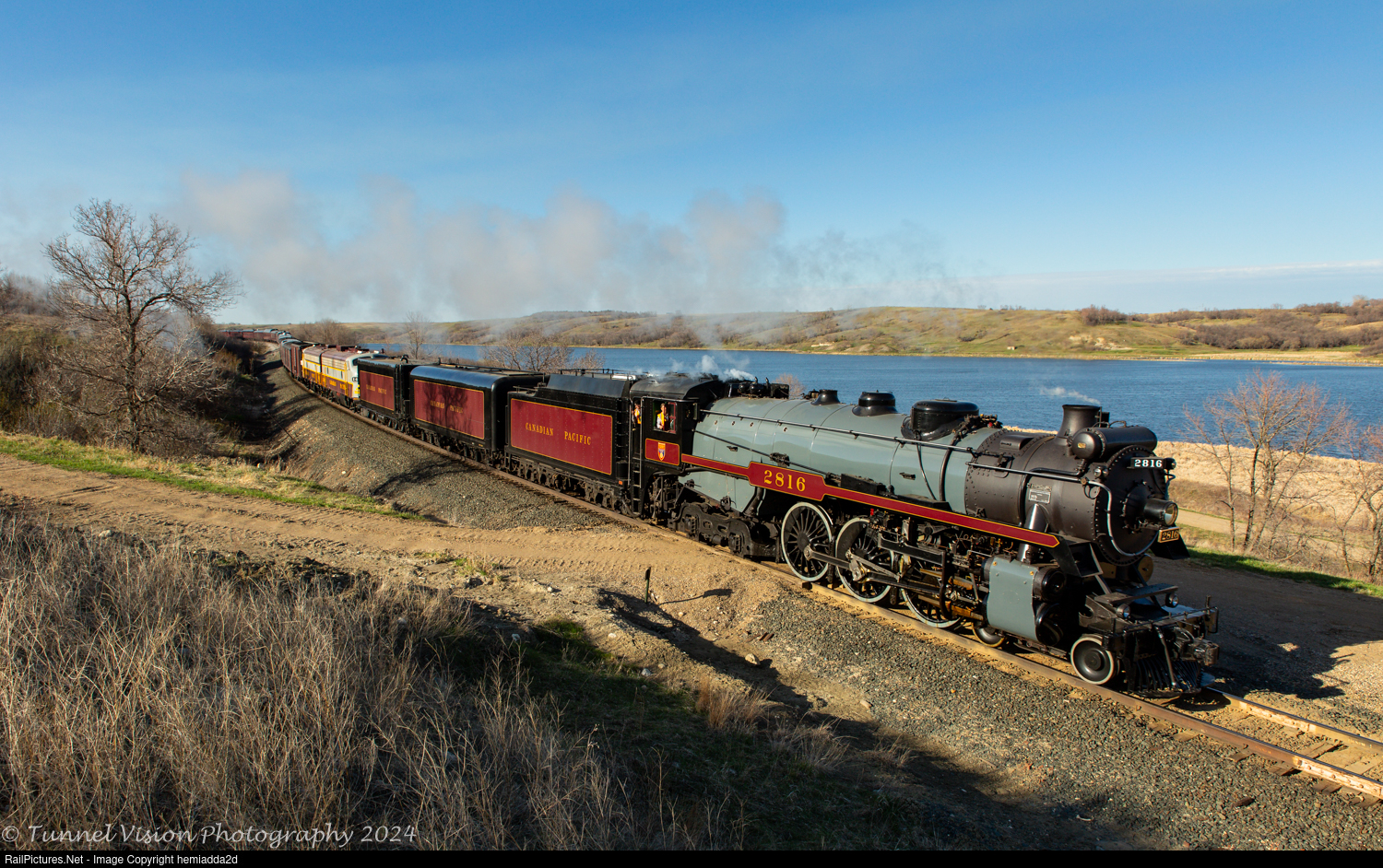 The much-awaited return of steam to North Dakota was met with a phenomenal show from the whole CPKC crew. After a lengthy delay at Portal, ND for diesel maintenance, the CP Empress steam locomotive glides gracefully down Kenmare Hill and Upper Des Lacs Lake. Photo from Des Lacs National Wildlife Refuge.