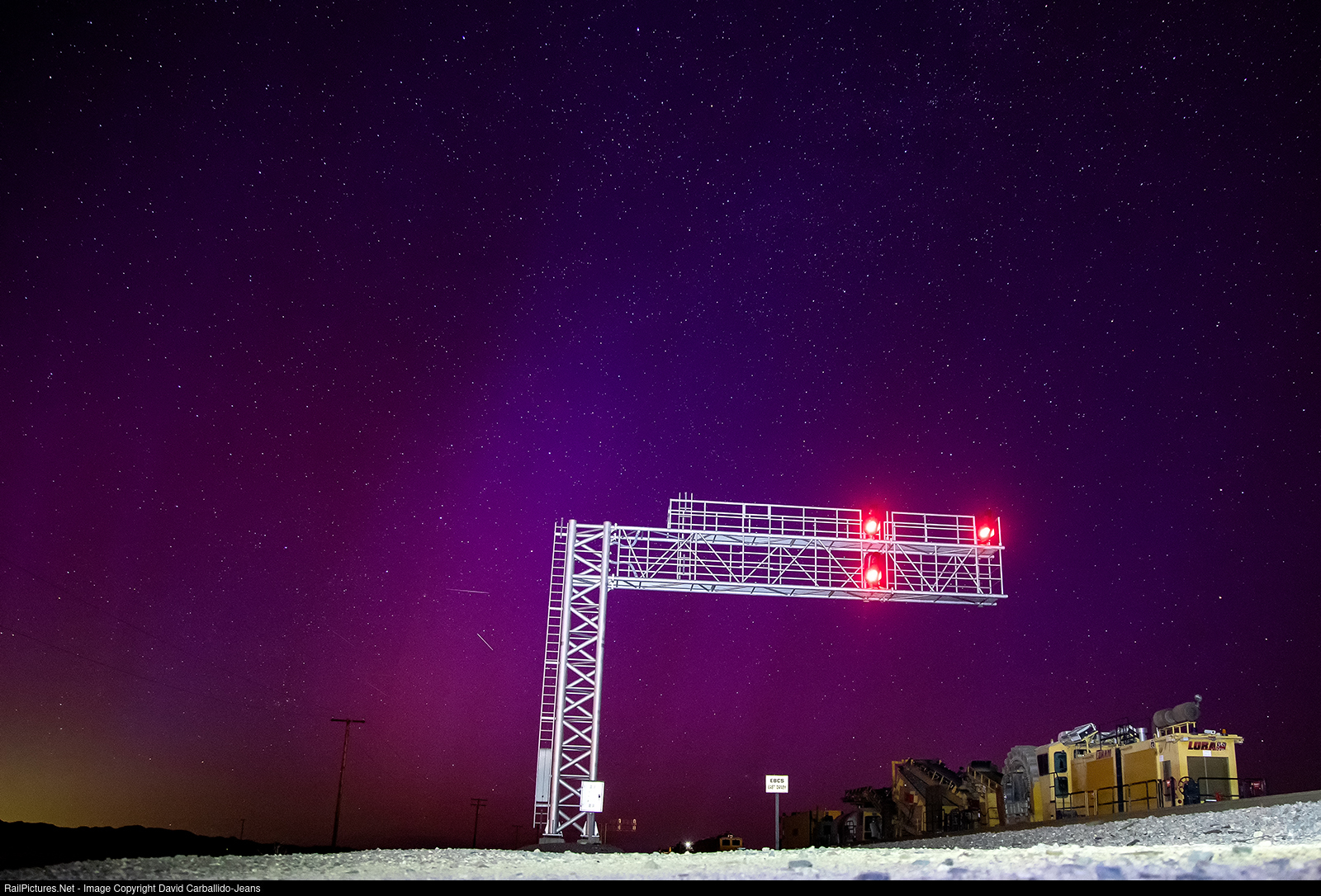 Aurora Borealis was slightly visible along BNSF's Needles Sub at Danby. All red across the board at the EBCS East Danby as an eastbound Z-train approaches for a crew change. Once it clears the west end, a red over green signal would appear for the another Z-train would over take the stopped Z-train.