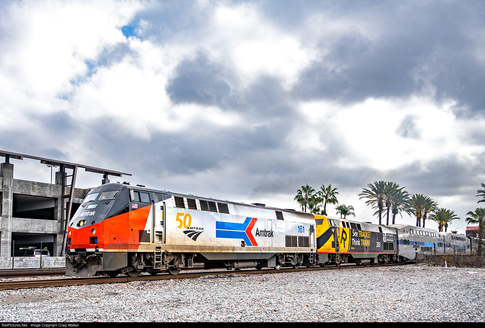 Just 1 hour 42 minutes late (believe it or not, that’s not too bad for Amtrak 3, the westbound Southwest Chief), Amtrak P42DCs 161 (dressed in the carrier's original paint scheme for their 50th Anniversary) and 203 (painted for Operation Lifesaver, an organization promoting safety when encountering railroad tracks) as the train, which originated in Chicago IL, heads for its final stop, Los Angeles. The train has eight cars, but the first two are not Amtrak cars, but rather Metrolink cars returning to LA after being rebuilt in Wisconsin … and now decked out in Metrolink's third paint scheme for passenger cars, which originated in late 2023. (Fullerton, California – May 9, 2024)