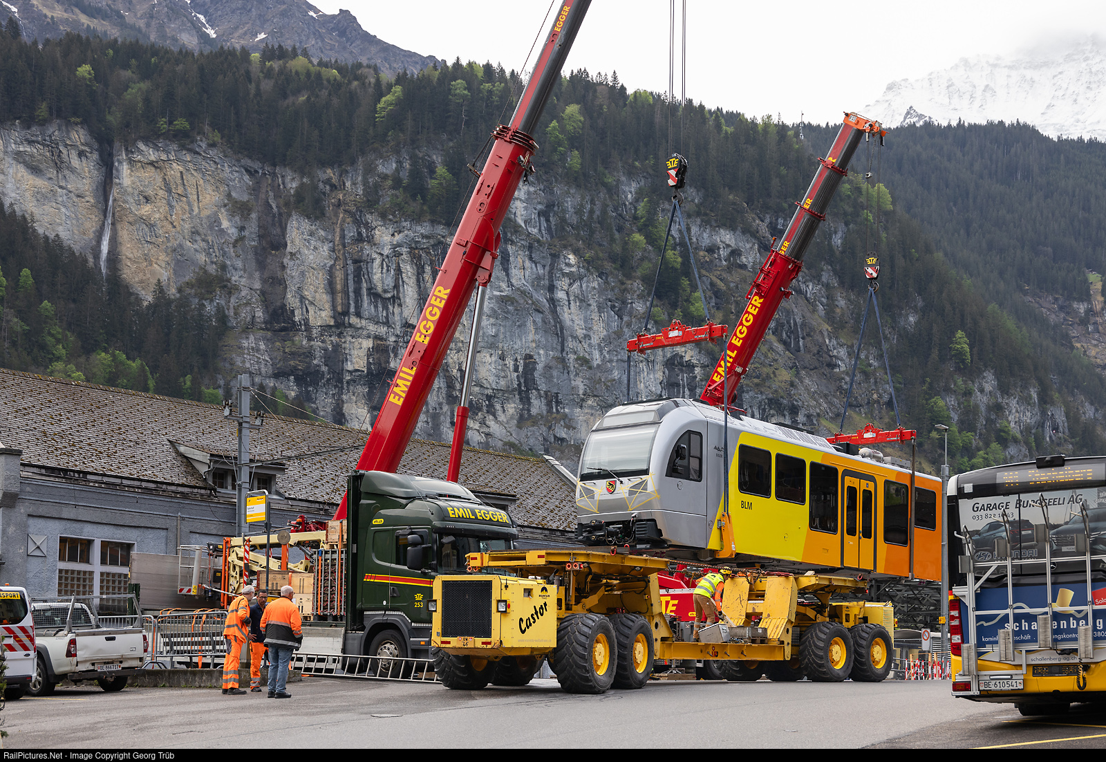 The Lauterbrunnen-Mürren mountain railroad (BLM), which belongs to the Jungfraubahn Holding, consists of an aerial cableway from Lauterbrunnen to Grütschalp and a meter-gauge adhesion railroad a good 4 kilometers long from Grütschalp via the Winteregg crossing station to Mürren. StadlerRail is supplying three new Be 4/6 # 101 to # 103 double railcars for the Grütschalp-Mürren line. The first vehicle # 102 was delivered in October 2023 already for tests. On 13 and 14 May 2024, the two car bodies of train # 101 "Eiger" were transported by special transport from Lauterbrunnen (797 meter a.s.l.) via mountain roads to Winteregg (1578 meter a.s.l.), where they were mounted on the bogies. The special vehicle "Castor + Pollux", which belongs to the company Mountaintrans AG, was used for the transport. Von Rotz & Wiedemar Seilbahnen in Kriens, in collaboration with Wipfli Transporte AG, is responsible for the know-how, operation and maintenance. Two red cranes of Emil Egger lift the carbody on the "Castor+Pollux" transport vehicle on the station square in Lauterbrunnen.