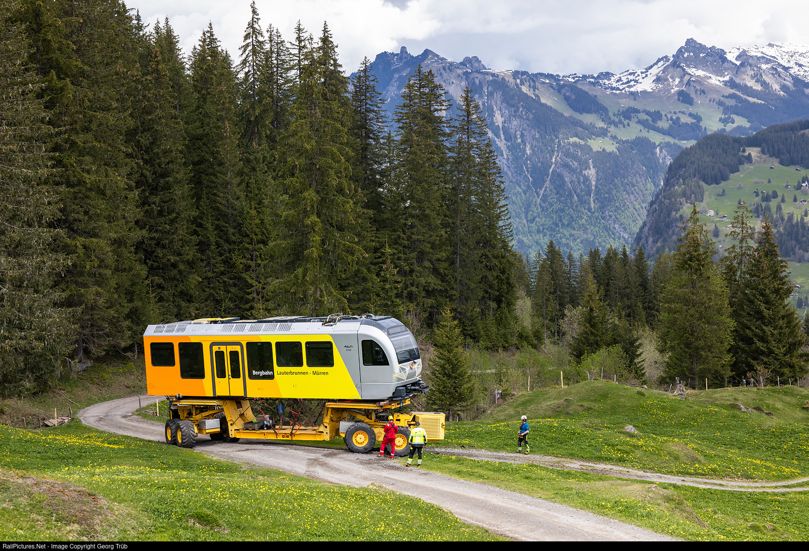 The Lauterbrunnen-Mürren mountain railroad (BLM), which belongs to the Jungfraubahn Holding, consists of an aerial cableway from Lauterbrunnen to Grütschalp and a meter-gauge adhesion railroad a good 4 kilometers long from Grütschalp via the Winteregg crossing station to Mürren. StadlerRail is supplying three new Be 4/6 # 101 to # 103 double railcars for the Grütschalp-Mürren line. The first vehicle # 102 was delivered in October 2023 already for tests. On 13 and 14 May 2024, the two car bodies of train # 101 "Eiger" were transported by special transport from Lauterbrunnen (797 meter a.s.l.) via mountain roads to Winteregg (1578 meter a.s.l.), where they were mounted on the bogies. The special vehicle "Castor + Pollux", which belongs to the company Mountaintrans AG, was used for the transport. Von Rotz & Wiedemar Seilbahnen in Kriens, in collaboration with Wipfli Transporte AG, is responsible for the know-how, operation and maintenance. The journey on the 7,5 kilomter long, partly not paved road to the Winteregg needed about 4 hours. The transport is now below Winteregg, with the peaks above the Schynige Platte and the 2230 meter high Loucherhorn on the right in the background. At this point, the direction of travel of the transporter was changed.